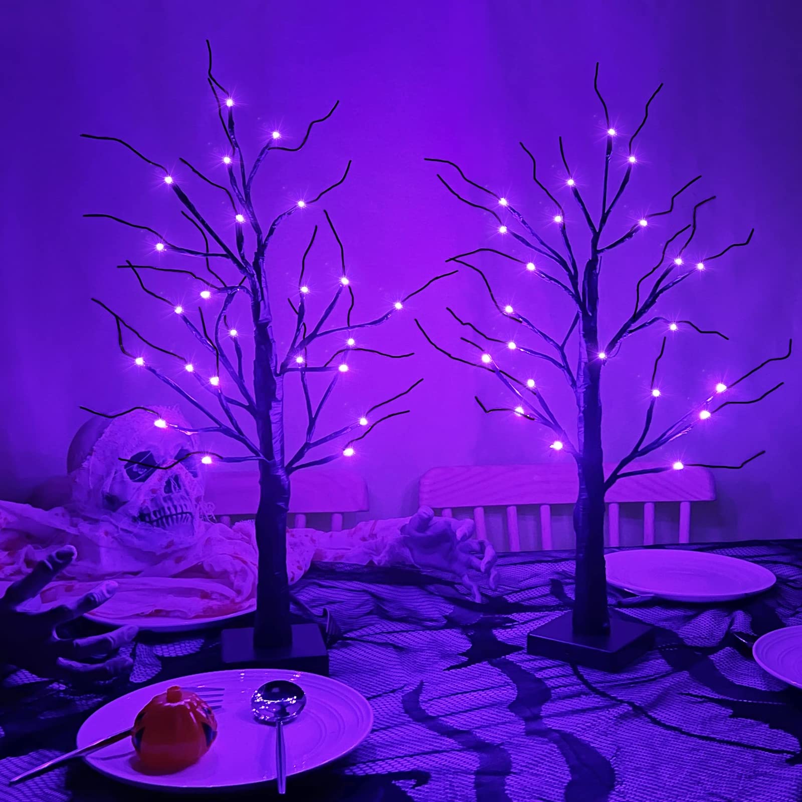 • 2 Pack 24 Inch Halloween Birch Tabletop Tree: 2 Pack 24 Inch Halloween Birch tabletop tree, each has 24 LED purple lights, 24 branches, 6 big branches, 4 x 4 inch square base. It sits sturdily in its stable base