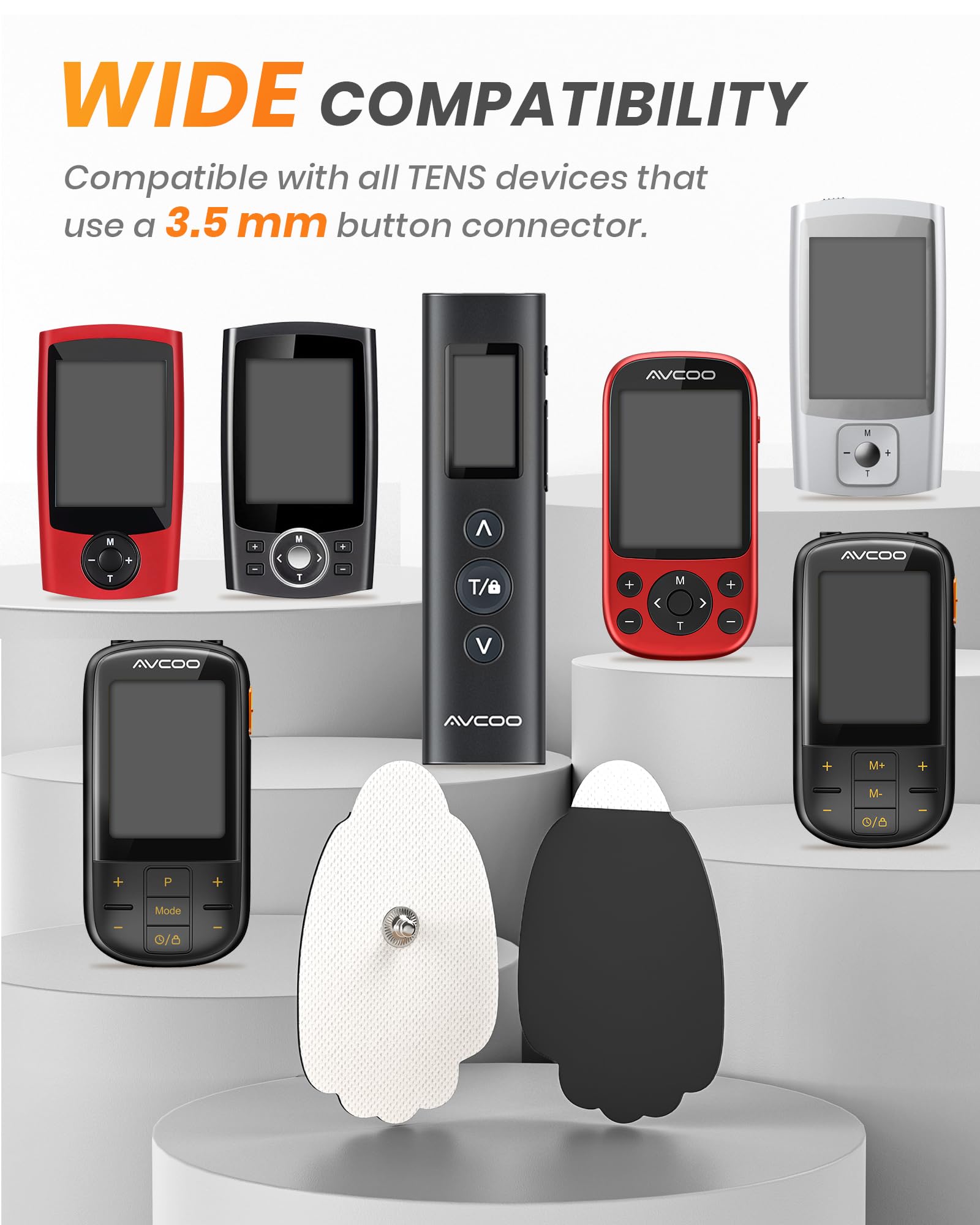 • 20-Pack Pads: AVCOO palm-shaped TENS Pads fit all TENS/EMS devices (except for wireless TENS unit) that use snap-on connector (3.5mm) leads, and perfectly match your elbow, knee, shoulder, back, etc.