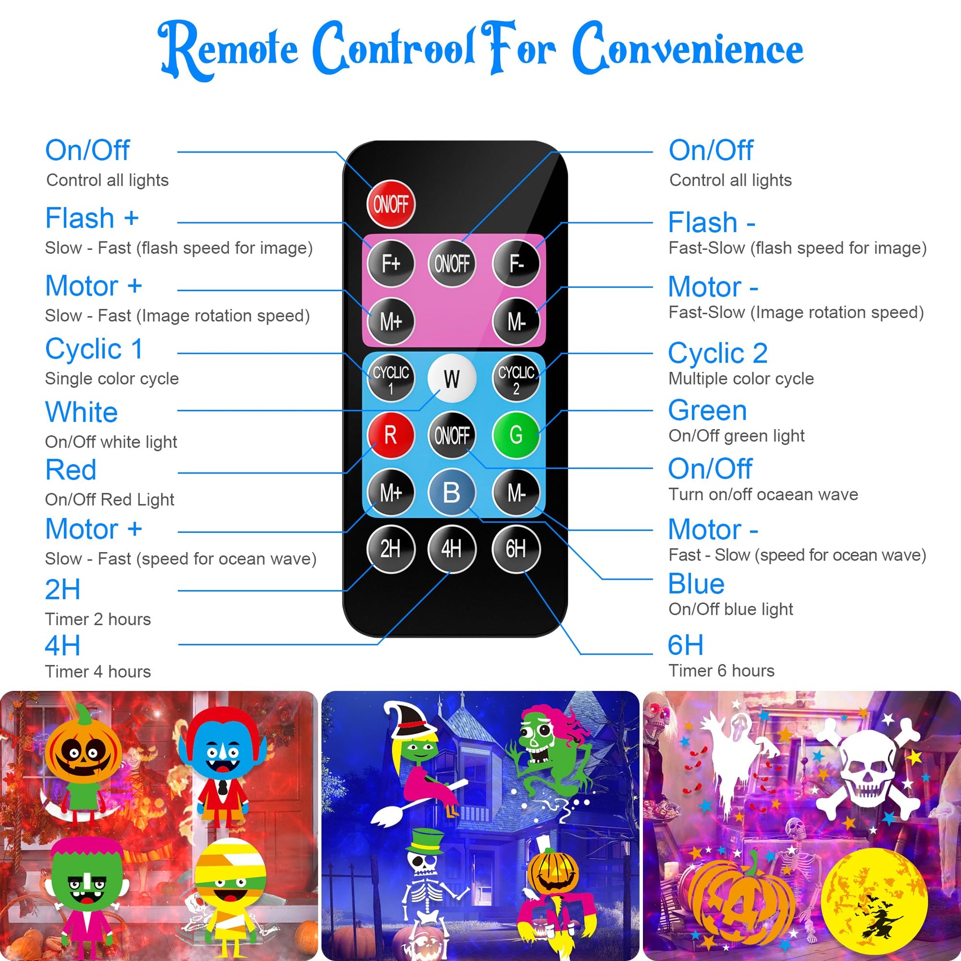 • Multi-color Lights & Pattern Projector: The Halloween projector has two projection heads, RGBW water wave ripple effect & patterns image projector. 20 different colorful pattern and 10different color, the ocean wave and cute pattern for holidays party and birthday.