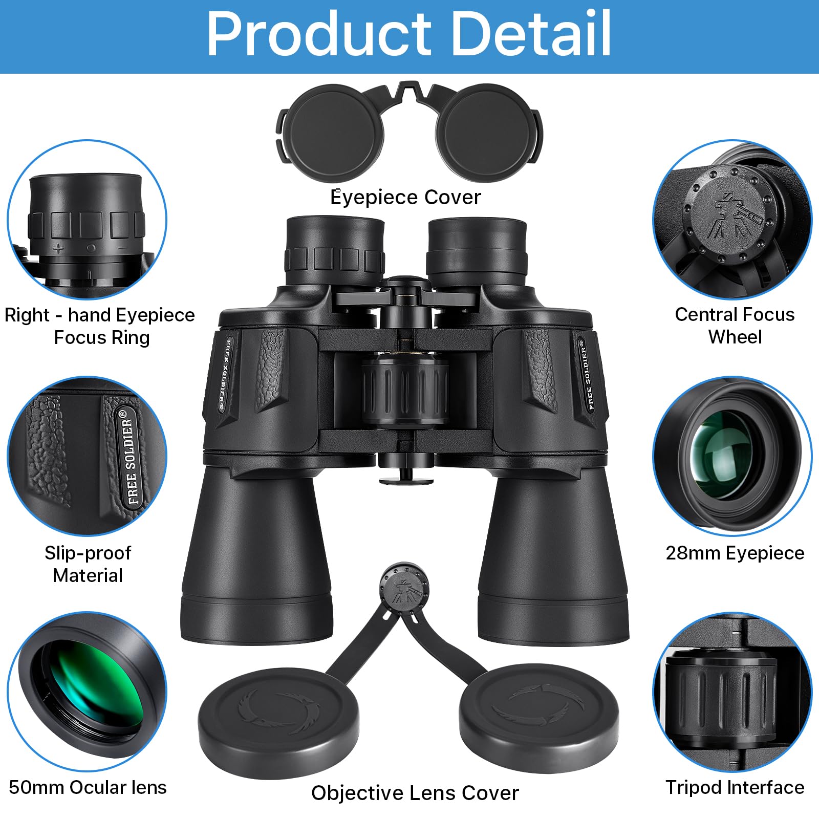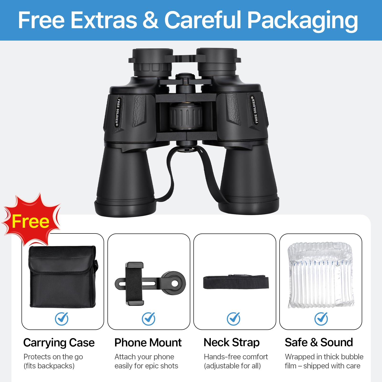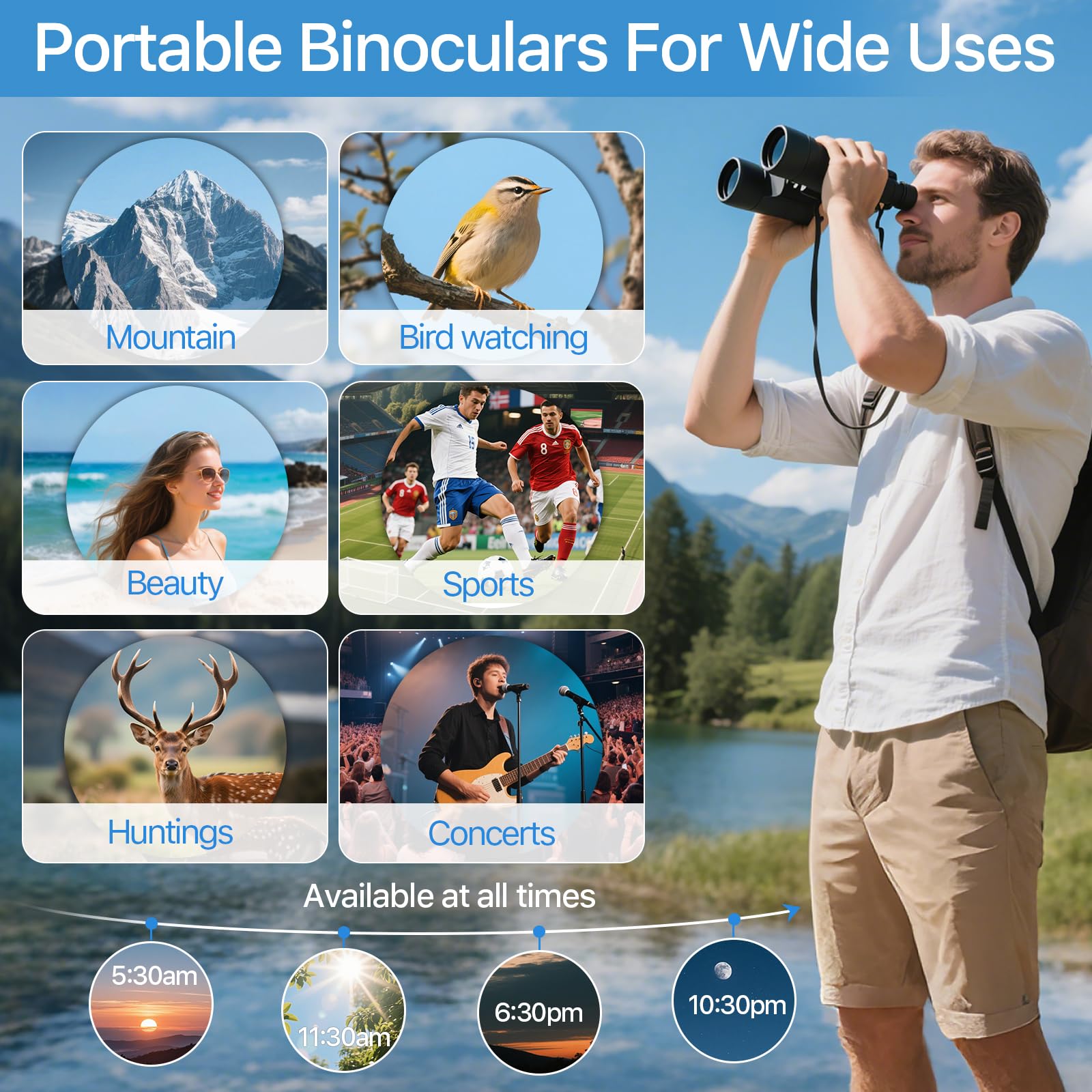 • Powerful Binoculars: The binoculars for adults have 20X power magnification, 50mm large objective lens, large field of view of 1000 yards, making them good for fast-moving subjects. They are easy to operate binoculars for adults and kids, perfect binoculars for bird watching, hunting, travel, opera, concert, sports games, safari