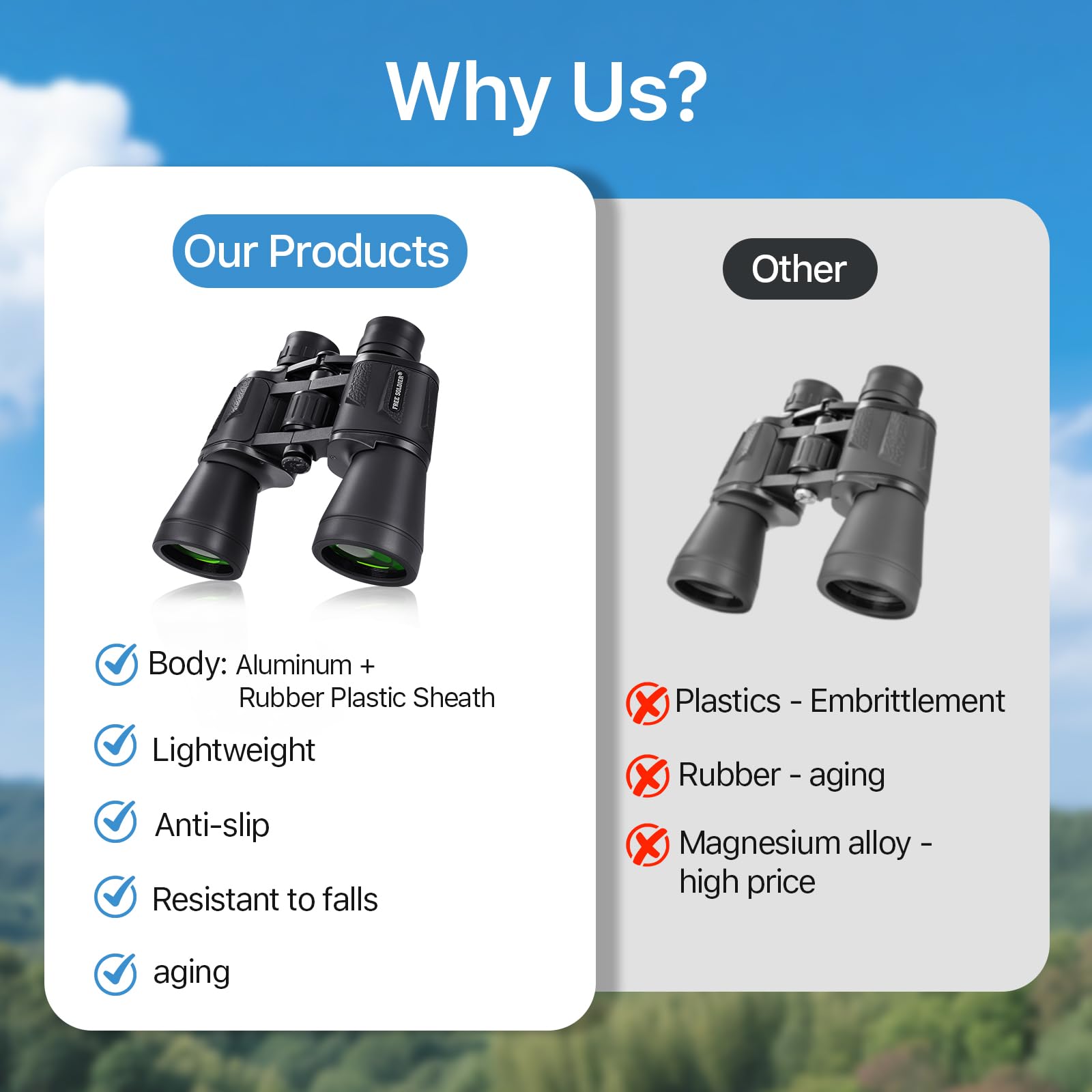 • Low Light Night Vision: The binoculars with 50mm lenses are larger than usual to give lots of light-gathering power, so the more effective they will be in low light, Deliver clear vision in weak light conditions but not in complete darkness. Non-slip rubber grip pads for secure grip in all weather conditions