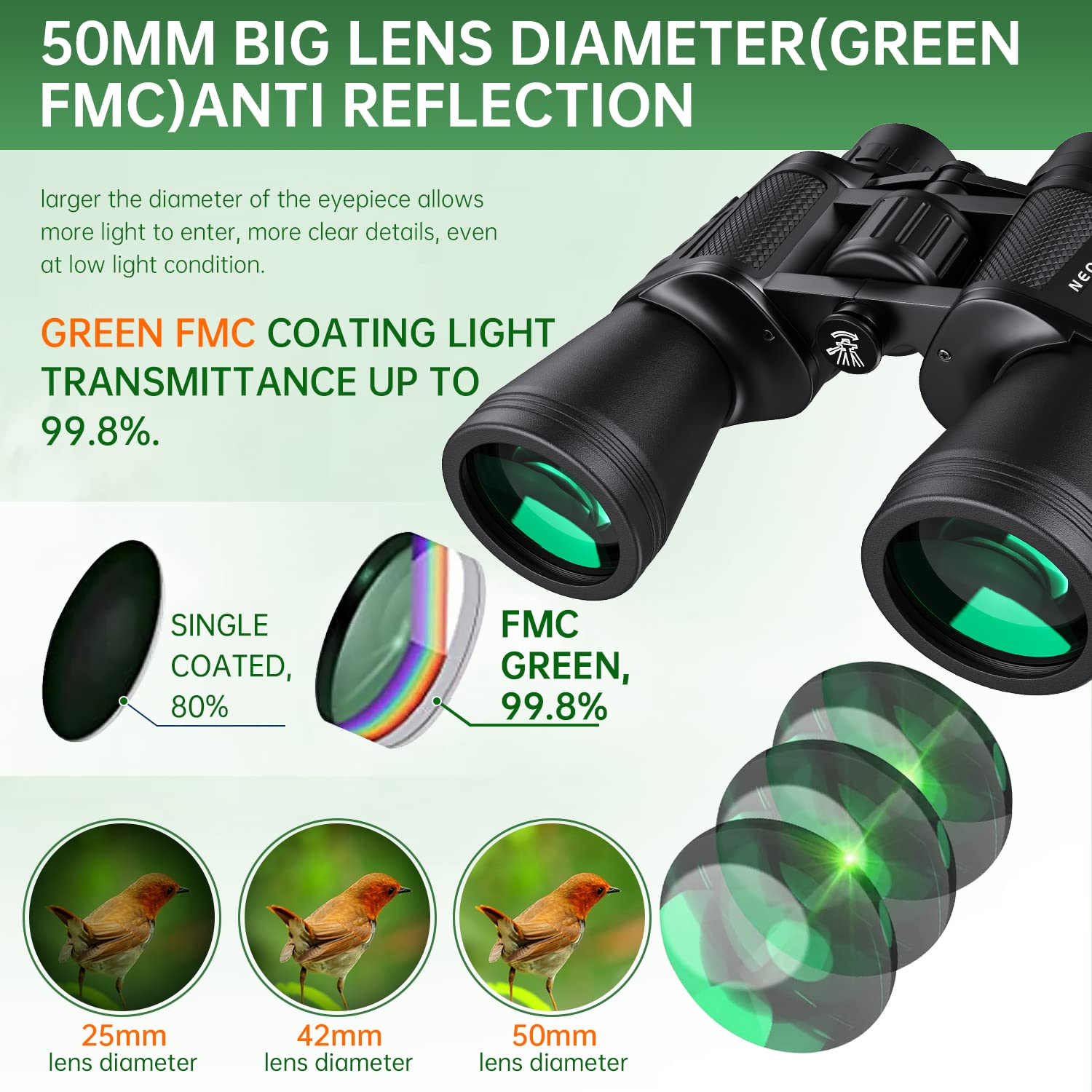 • ULTRA CLEAR IMAGE - Multilayer-coated aspherical lens elements provide superior light transmission and minimal distortion, better image brightness, contrast, and quality. BAK4 Porro Prism has a higher refractive index. It provides 99.8% light transmission and improves color reproduction. Green FMC anti-reflective coating reduces the reflected light in the objective lens. It enhances light transmission, image brightness, and image sharpness. It will give you an extraordinary using experience.