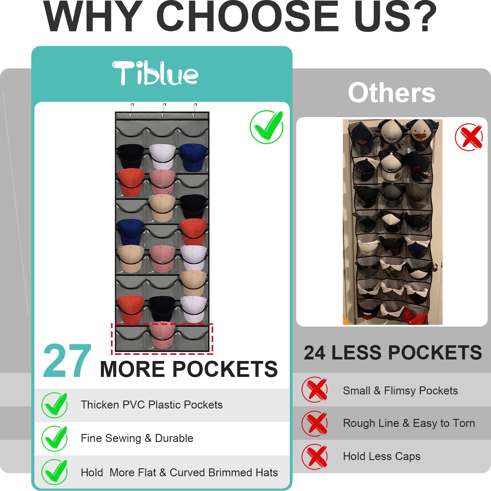 • Holds Up to 27 Caps: Tiblue hat racks for baseball caps hanging over the door wall closet comes with 27 transparent pockets that easily store and showcase at least 27 hats, 3 more pockets than other hat organizer for baseball caps with 24 pockets on market. Designed with upgraded interface, our baseball cap organizer over door can effortlessly hold multiple flat & curved brimmed hats in its deep 3.5 inch pockets! Make your home tidy & cleaner than before