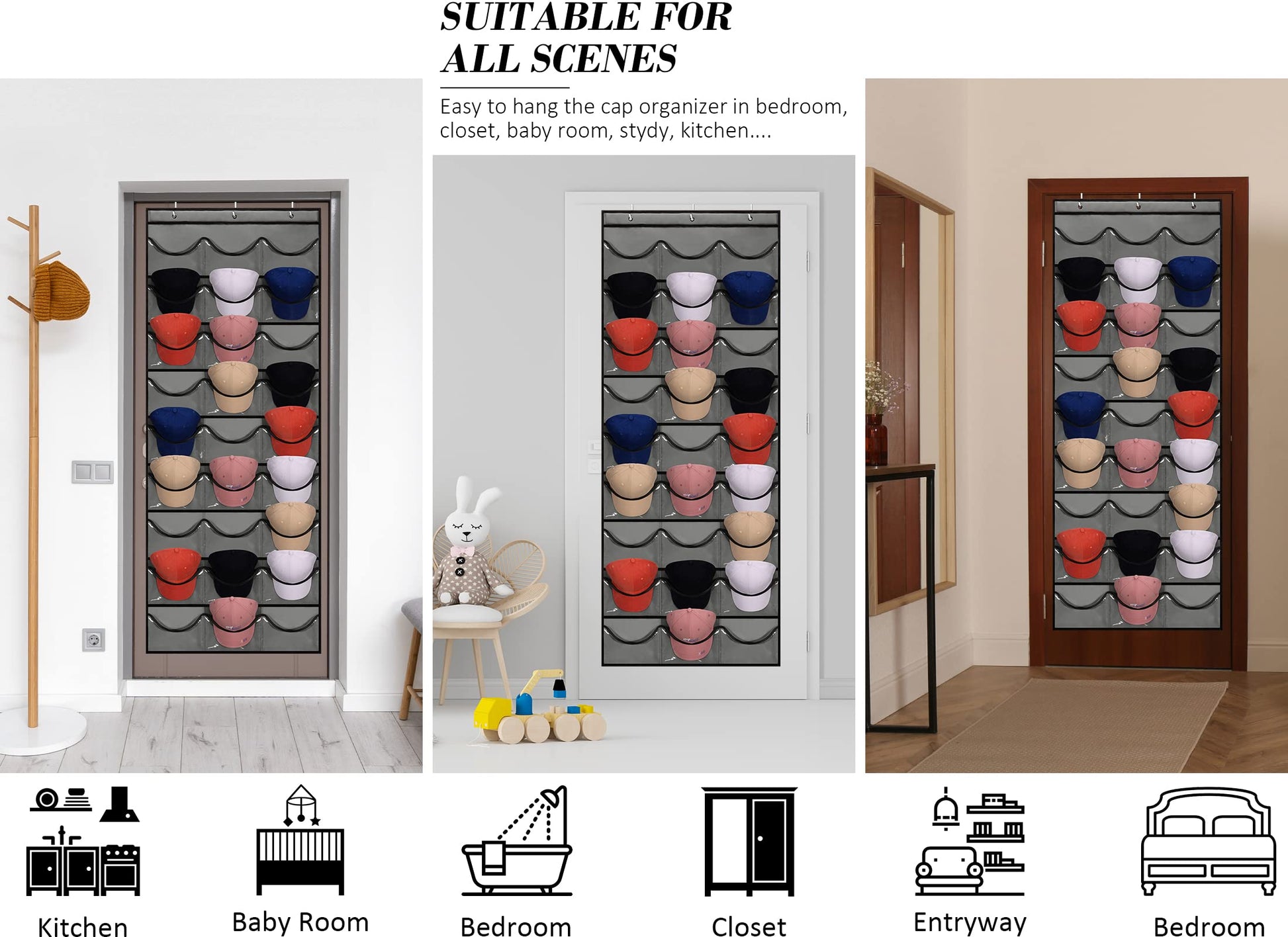 • Premium & Durability:Made of thickened & breathable non-woven fabric, come with 27 extra deep PVC pockets, our baseball hat storage rack behind the door closet organizer will prove to be work for long-lasting use and is collapsible for travel. The polyester fiber material and fine sewing make the hats hanger baseball caps organizer much more durable than other hat holder. 3 hooks fit for door as thick as 1.35-1.75”,hang it over door & close door easily. Every cap collector needs