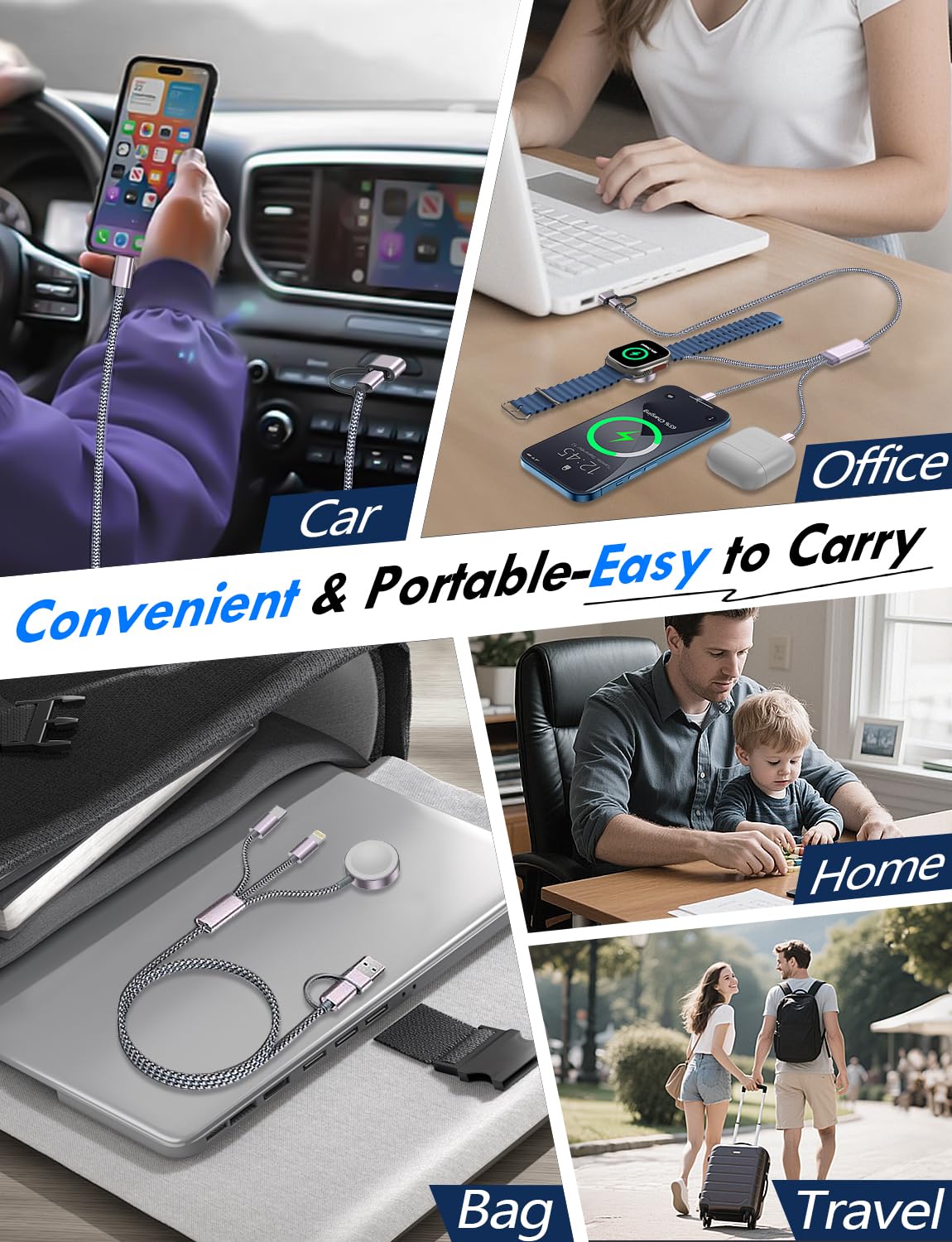 • 【3 in 2 Multi Charging Cable】Includes a 4ft 3 in 2 charging cable that features USB C/USB A input ports and three output ports: Type-C, Lighting and for apple watch charger.The multi charger cable is compatible with both USB C and USB A chargers, making it a versatile option for various devices(designed for iWatch Series 2-10,SE/Ultra models,compatible with iPhone 16-11 and newer models,and alos for iPads,Samsung Galaxy S25-21,Airpods,car charging etc.) Supports Nintendo Switch Cable Note:Not for samsung watch!!!