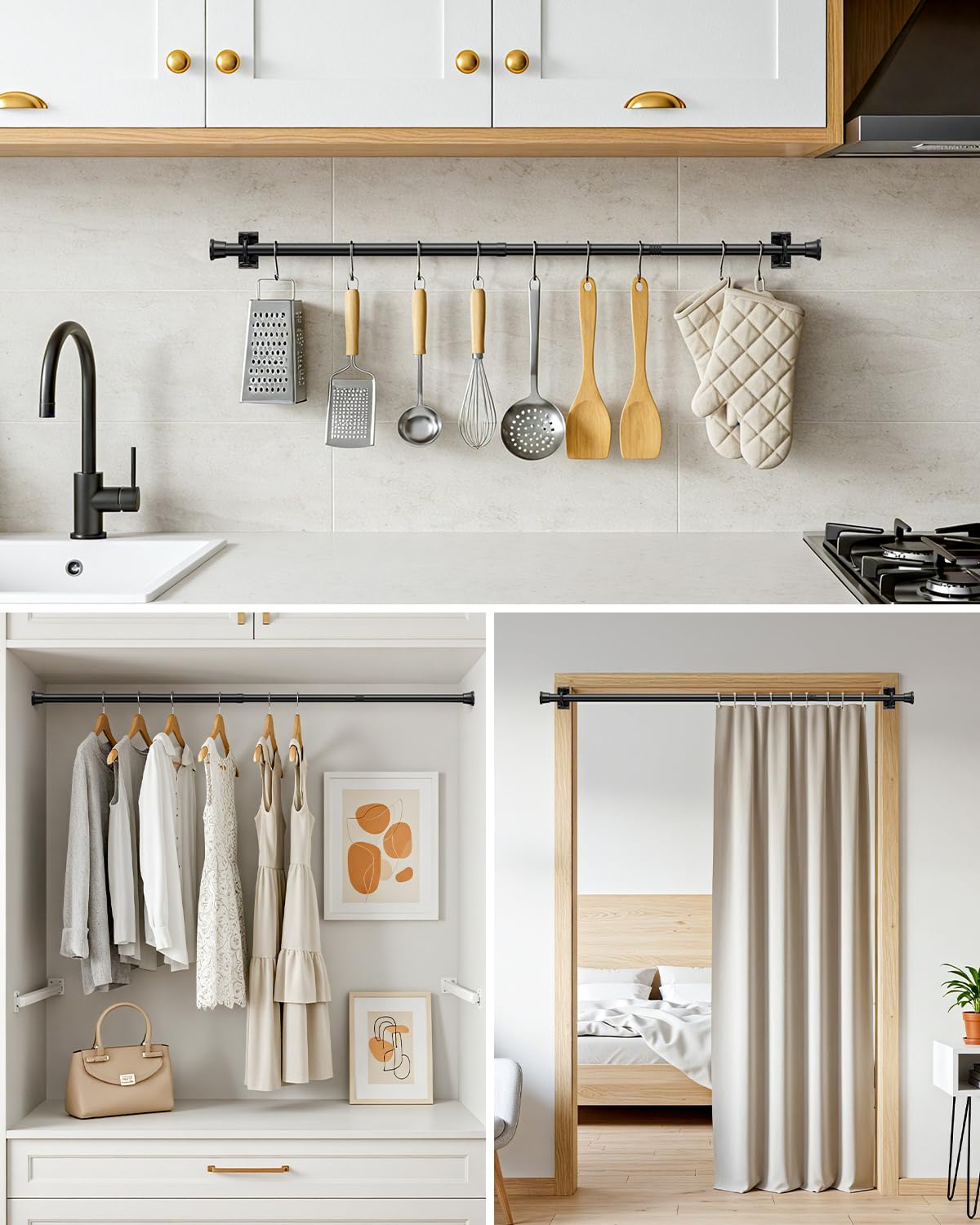 • 【Material】:This small curtain rod was made of high-quality stainless steel. It is resistant to rust, bending, and deformation. The sleek black paint finish adds a touch of simplicity and elegance, making it perfect for your home.