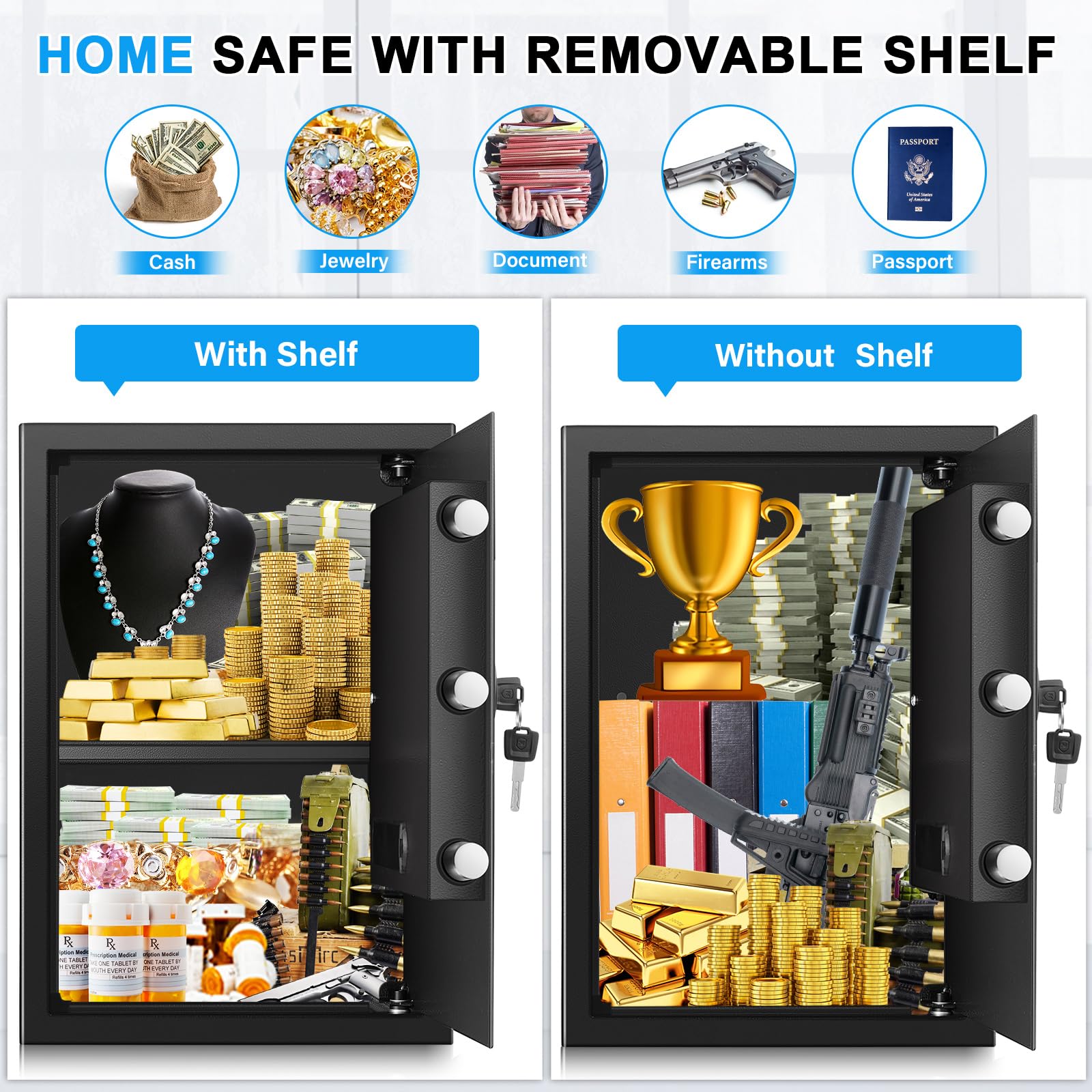 • LARGE SAFE BOX FOR HOME USE: Our home safe has a smart capacity of 14.57'' x 12.2'' x 19.68'', supper large inner space for storing almost of your valuables, including laptops, pistols, jewelry, documents, cash, and more. Perfect choice for you to protect your valuables from the theft, children or nosey visitors