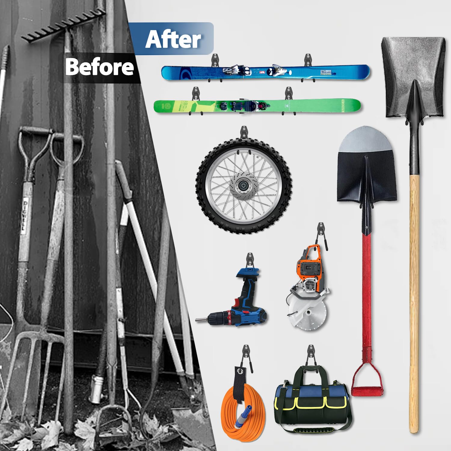 • Multi-Use Utility Hooks: The storage hooks for hanging in garage are ideal for garage, garden, shop, basement, warehouse, shed, or man cave, etc Outdoor occasions. Our garage hooks for hanging can provide a great solution to use garage storage space more efficiently, the garage organization can hang various items like garden tools, ladders, bikes, strollers, chairs and so much more