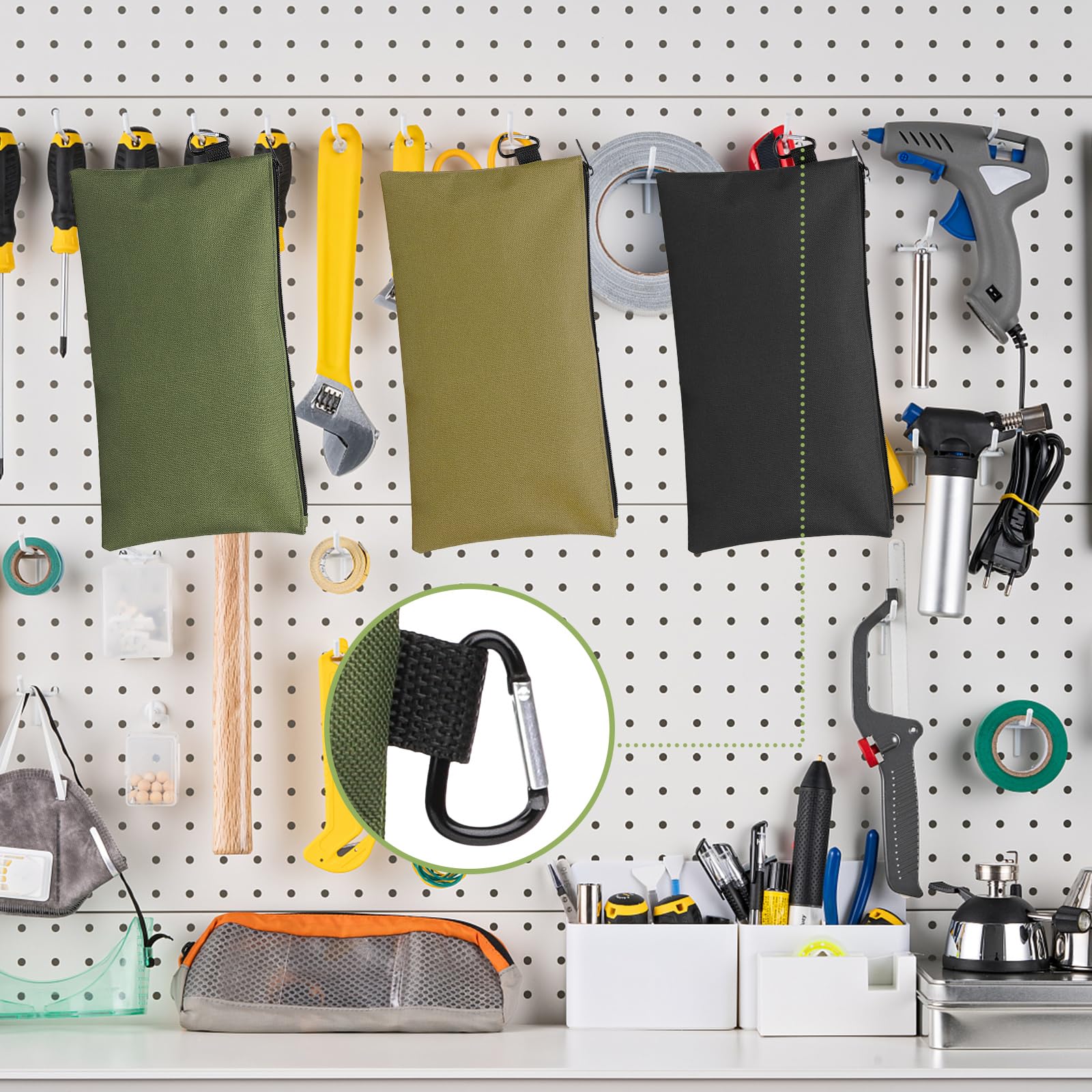 3 Pack Tool Bag Zipper Pouch, Premium Tool Pouch, Utility Multipurpose Storage Organizer Tool Pouches with Carabiner Metal Zipper for Tools, Stationary, Pencil Pouch (3 Pack, Tan, Navy Green, Black)