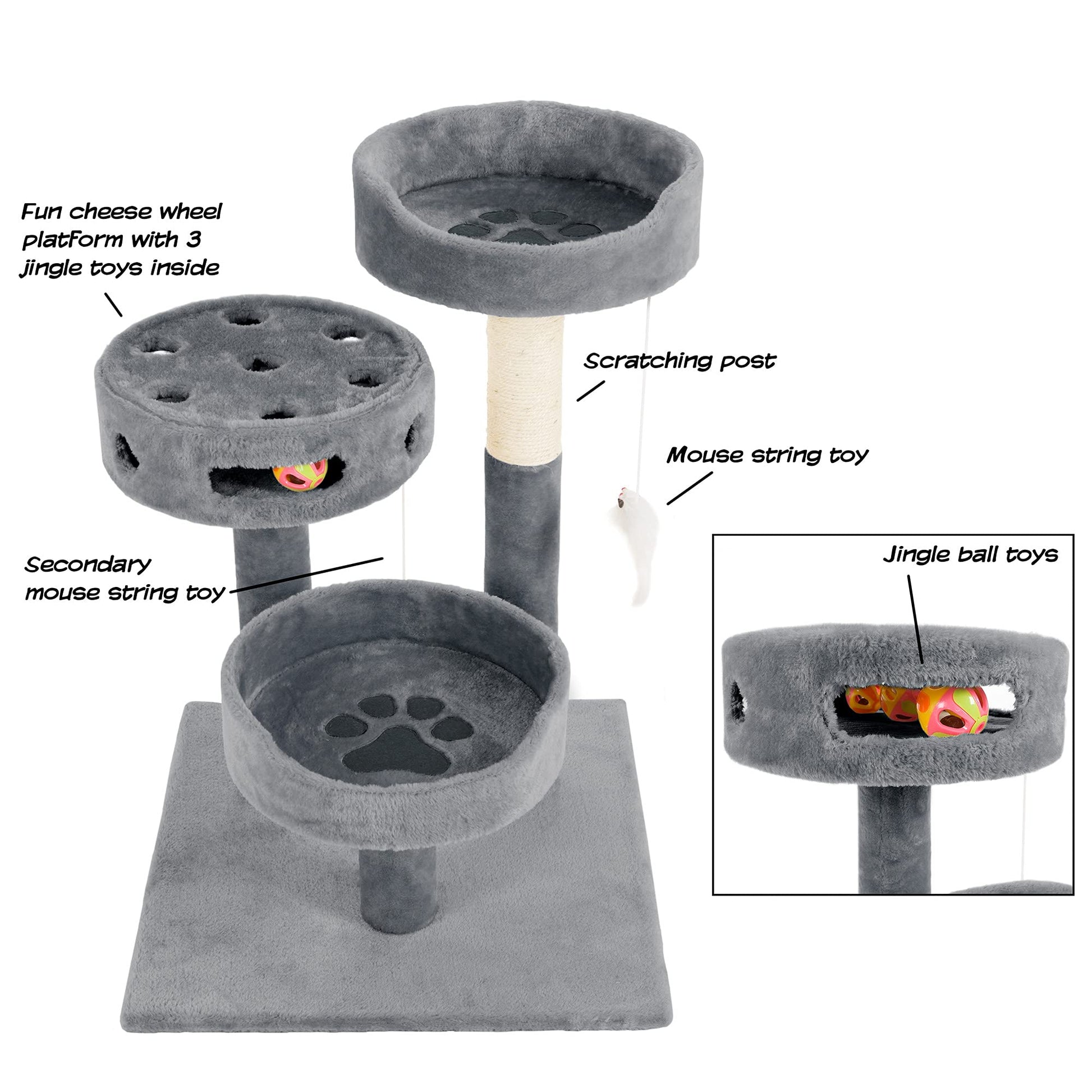 • 3-TIER CAT TREE TOWER - Provide felines with 3 levels of interactive fun with this cat tree for indoor cats. Built-in toys and a cat scratching post keep your kitty happy and entertained, while 2 spacious perches with raised edges offer cozy spots to nap.