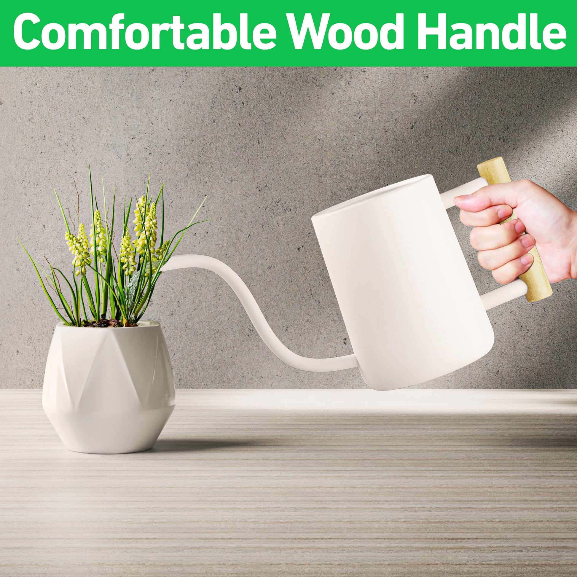 35 oz Metal Small Indoor Watering Can with Long Spout & Real Wood Handle for House Plants, Succulents, Cacti & Seedlings - White Long Spout Watering Can Indoor Plants - Stylish, Gentle Flow, No Spills