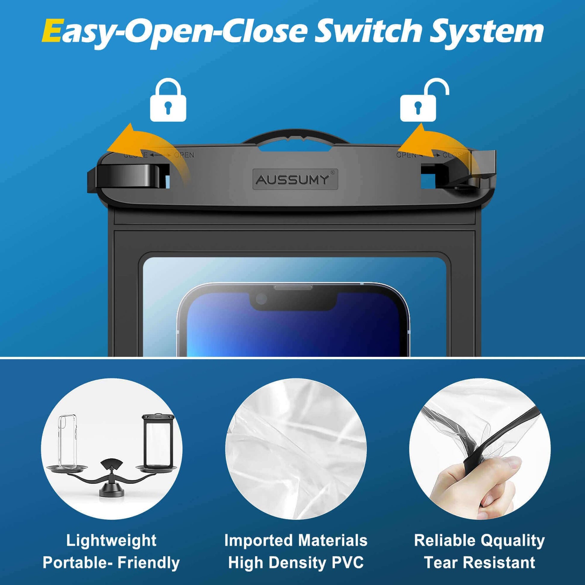 • 【Super Sensitive Touch】 Made with a transparent PVC material that offers a crystal clear display gives you excellent touch screen performance. Allowing you to text messages, call, watch videos, face recognition, and take selfies without taking out your phone from the pouch. When in water, recommended using the mobile hot key or Volume Buttons to operate. ABS materials snap and lock ensure durable use with scratch resistance and wear resistance.【Tips:NOT SUPPORT Touch ID】