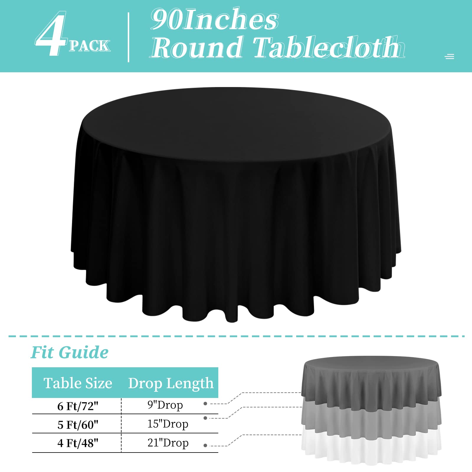 4 Pack Black Round Tablecloth 90 Inch - Circle Polyester Table Cloth for Round Table, Stain and Wrinkle Resistant Washable Fabric Table Cover for Wedding Party Banquet Restaurant Reception Dining