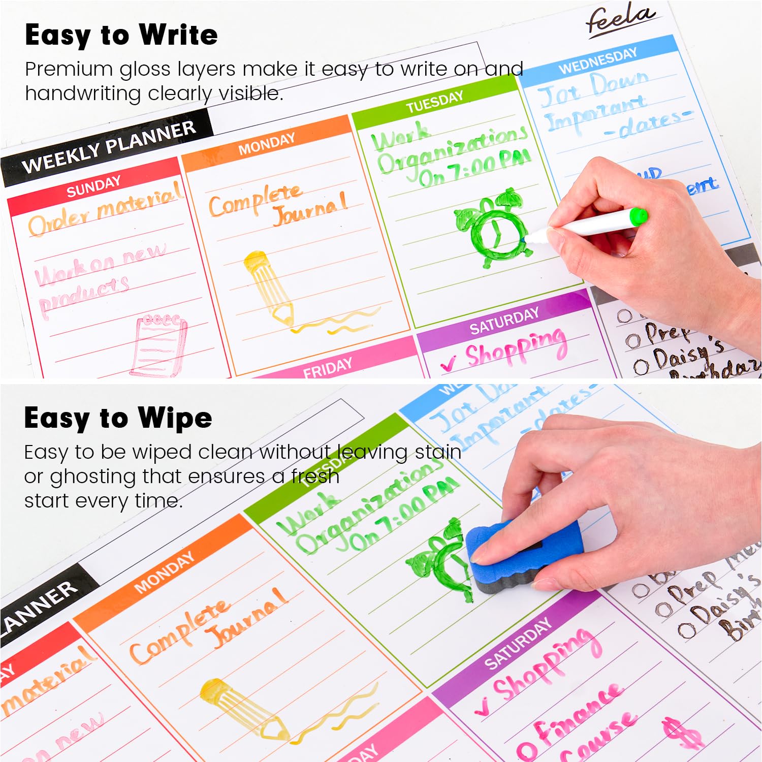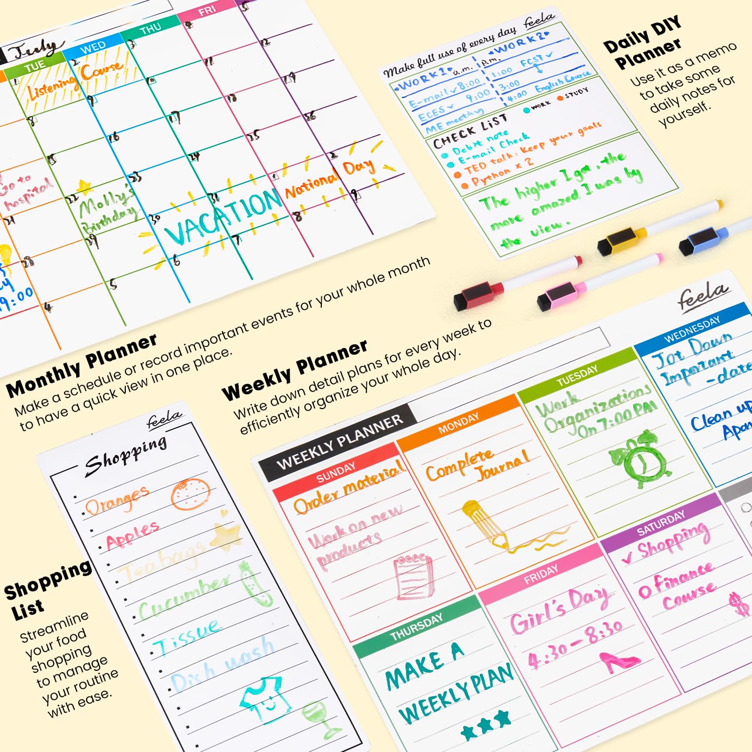 • Feela Dry Erase Magnetic Whiteboard Kit includes 1 monthly calendar, 1 weekly calendar, 1 shopping list, 1 DIY Note, 1 eraser, 8 magnetic erase markers and 10 magnetic stickers, which will be enough for family use.