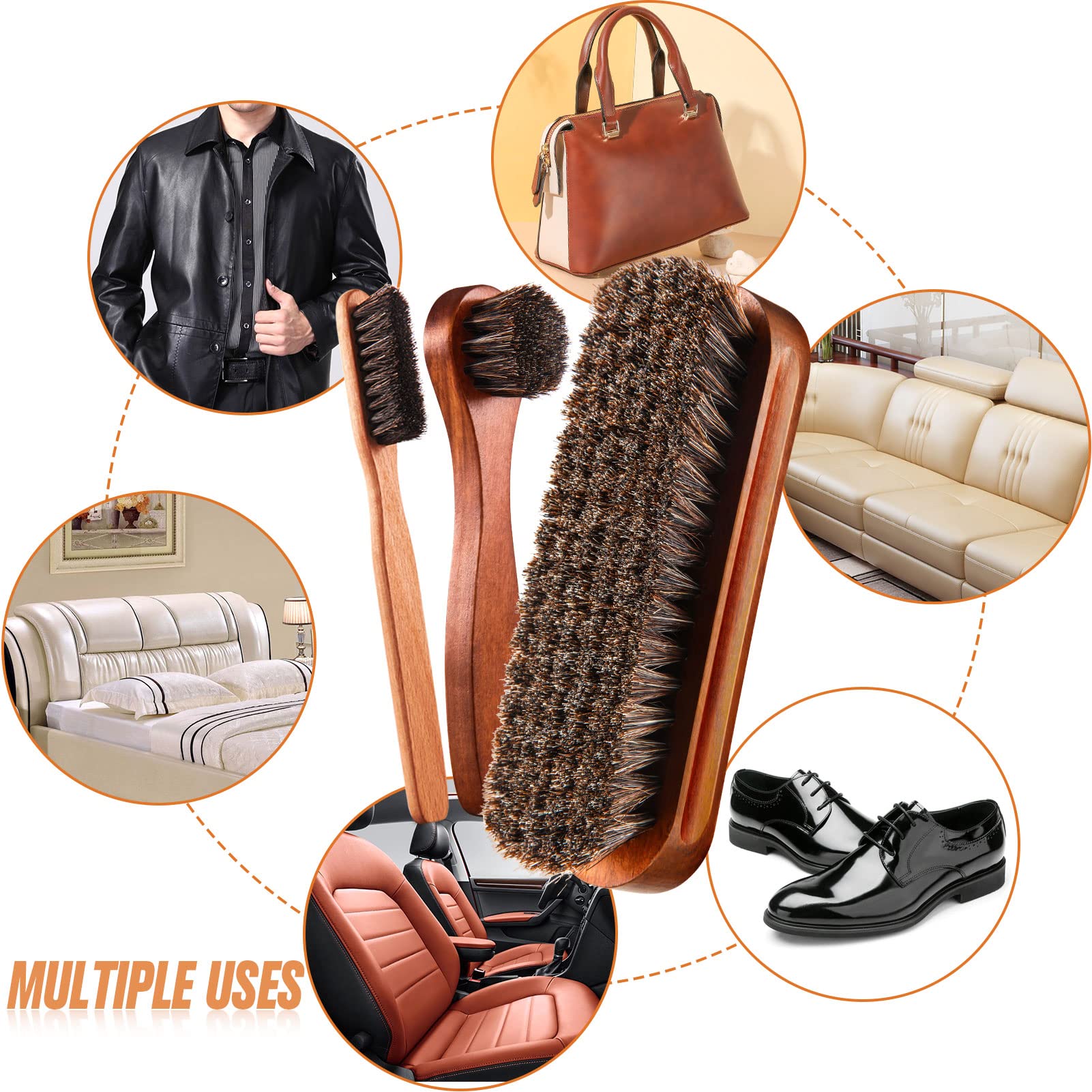 • Mufti-functional shoes brush set - This set contains 1 pieces shoes brushes, 1 piece mini shoe cream brush and 1 piece shoes shine cloth, suitable for shoes, handbags, luggage, boots, gloves, jacket, coat, car auto upholstery