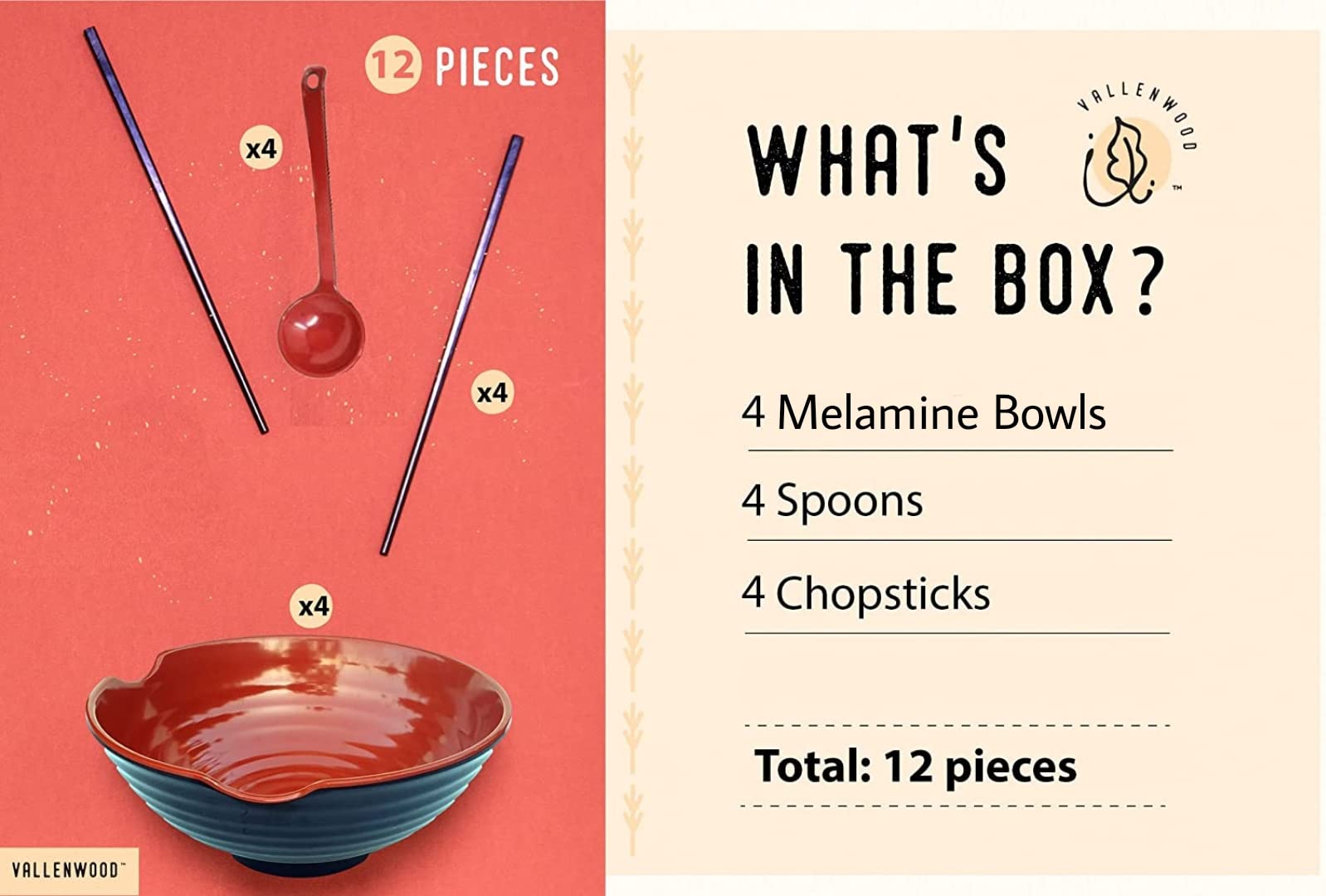4 XL Ramen bowl set. 12 Pieces Pho Bowls. Asian Japanese soup. Utensil: Spoons and Chopsticks kit. Melamine, Large 52 oz. Noodles, Rice, Udon, Thai, Chinese, Korean, Udon, Wonton, Miso, 9 inch