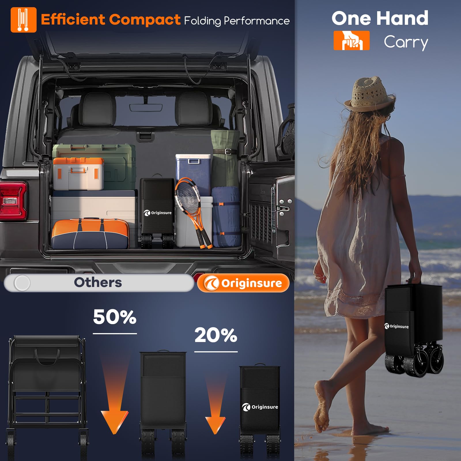 • ใ€๐Ÿญ๐Ÿฌ.๐Ÿฏ๐Ÿฒ ๐—ฐ๐˜‚ ๐—ณ๐˜ ๐—Ÿ๐—ฎ๐—ฟ๐—ด๐—ฒ ๐—–๐—ฎ๐—ฝ๐—ฎ๐—ฐ๐—ถ๐˜๐˜† ๐˜„๐—ถ๐˜๐—ต ๐—ฆ๐—บ๐—ฎ๐—น๐—น๐—ฒ๐—ฟ ๐—™๐—ผ๐—น๐—ฑ๐—ฒ๐—ฑ ๐—ฆ๐—ถ๐˜‡๐—ฒ ๐—ฃ๐—ผ๐—ฟ๐˜๐—ฎ๐—ฏ๐—น๐—ฒ ๐—–๐—ผ๐—น๐—น๐—ฎ๐—ฝ๐˜€๐—ถ๐—ฏ๐—น๐—ฒ ๐—•๐—ฒ๐—ฎ๐—ฐ๐—ต ๐—ช๐—ฎ๐—ด๐—ผ๐—ปใ€‘Originsure foldable wagon cart, 48.43 'L x 24.02 'W x 24.41 'H large unfolding size, 10.36 cu ft/300L massive storage space, triple the capacity of similar wagons. Adopting an innovative folding design that maintains its height, the Capacity reduces to 1.36 cu ft when folded, only 1/3 of other carts. Compact and space-saving, it can be perfectly stored in the car trunk and room corners.