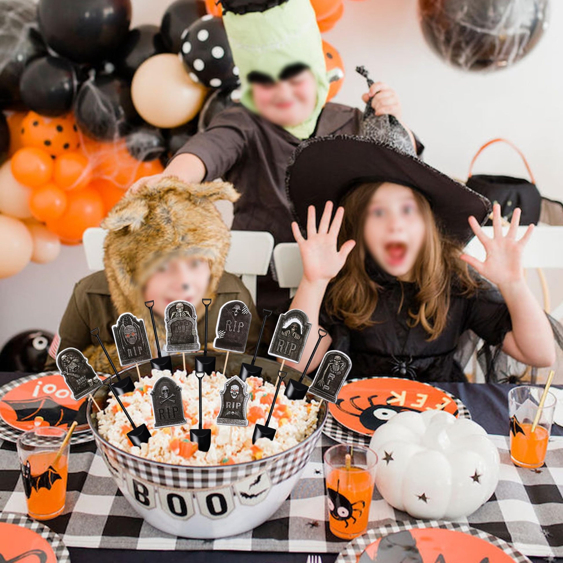 Details: 48 PCS Halloween Cupcake Toppers Tombstone Cupcake Picks Novelty Mini Shovel Spoons Horrible Graveyard Skeleton Cupcake Decorations for Halloween Theme Birthday Party Cake Decorations Supplies