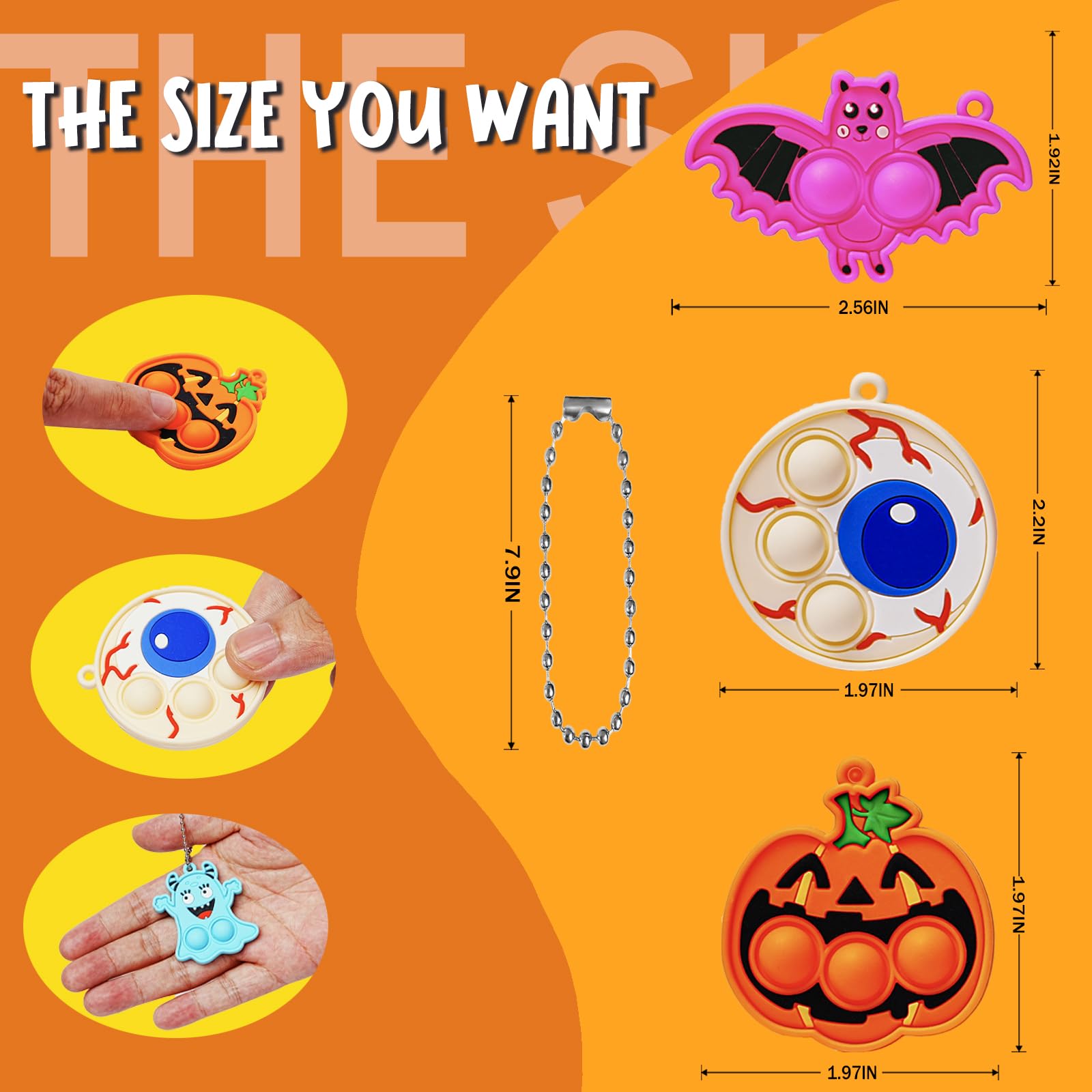 • HALLOWEEN FIDGET POPPER PACK: Includes 48 Halloween-themed Mini Pop Push keychains and 48 chains. (Total 8 shapes). It is a non-candy Halloween treat toy set that can also be used to decorate your Halloween party. The perfect Halloween decoration to help you get into the Halloween spirit faster!