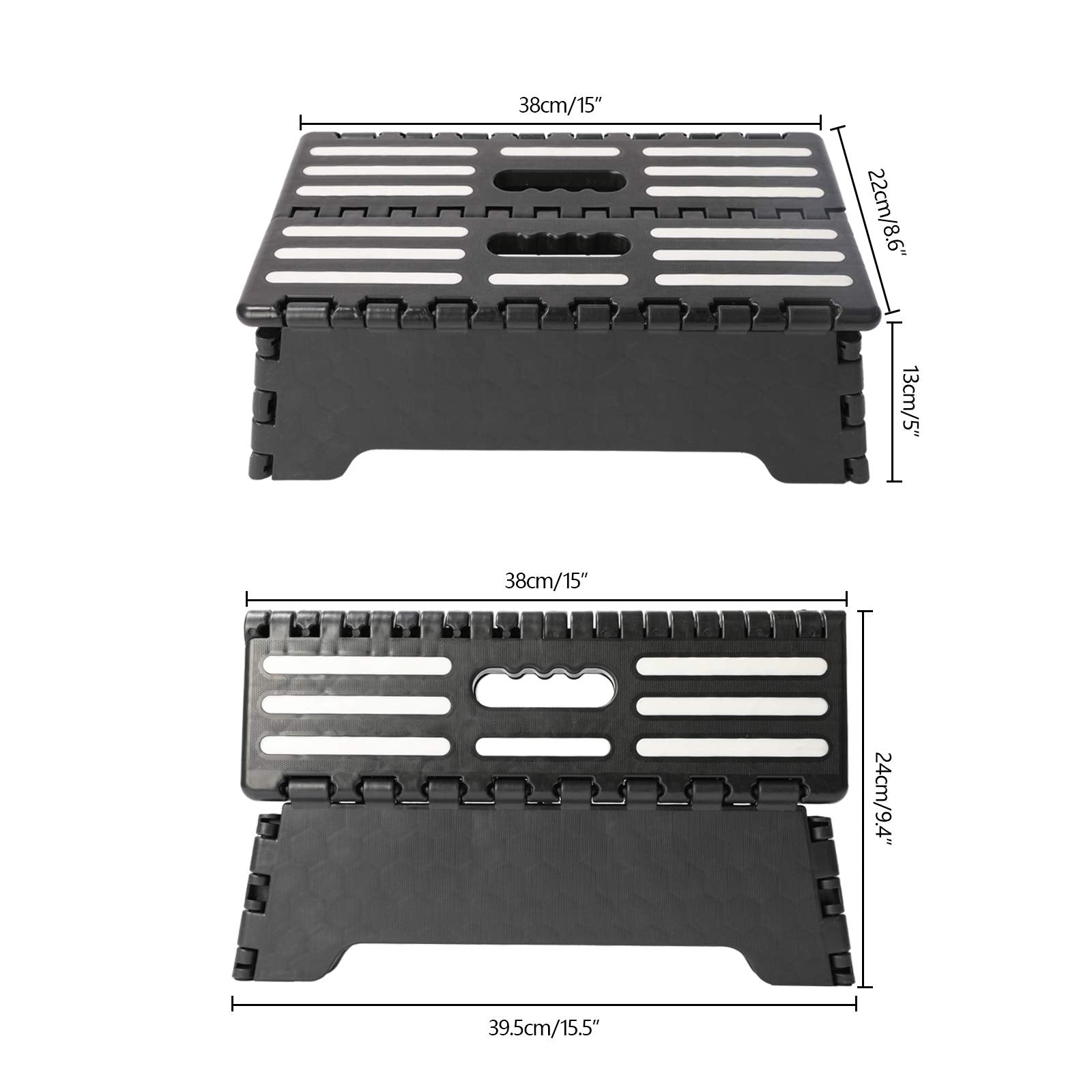 • 【Material】 The top of the portable fold down step has a rubber coating, which helps people maintain a sturdy footing while using the step,Made of high quality plastic, durable and environment friendly