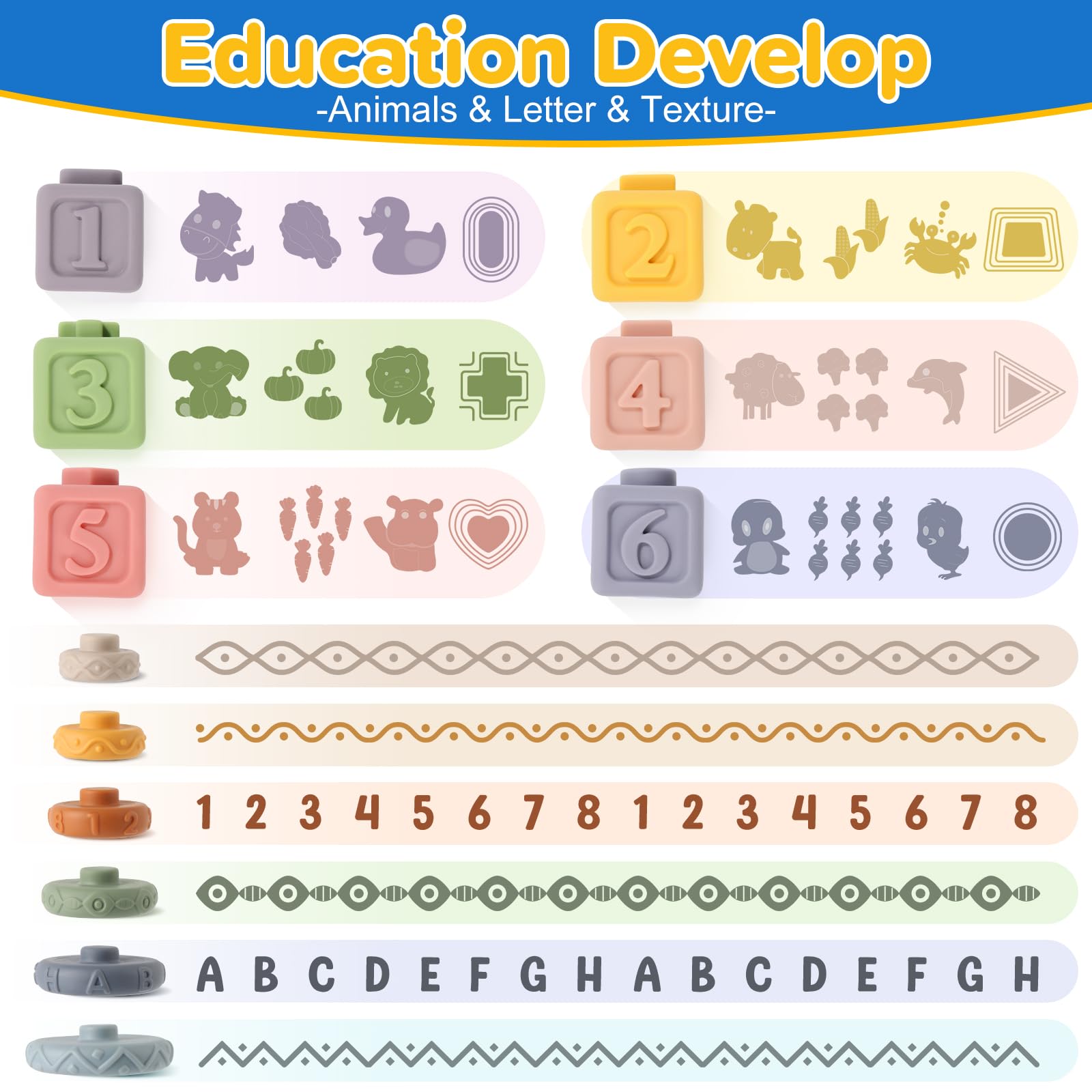 • Sorting & Stacking Toys Set: This contains different themed stacking activities, stacking blocks & stacking rings & stacking cups. They can stack, squeeze, and chew; They are great teething toys for babies 0-6-12 months; each soft building block has different colors, embossed animals, shapes, and numbers and wooden sorting puzzles, create various space classification combinations through different shapes, colors and quantities, Great for color, shape, texture, counting, visual development for babies aged 6-18 months