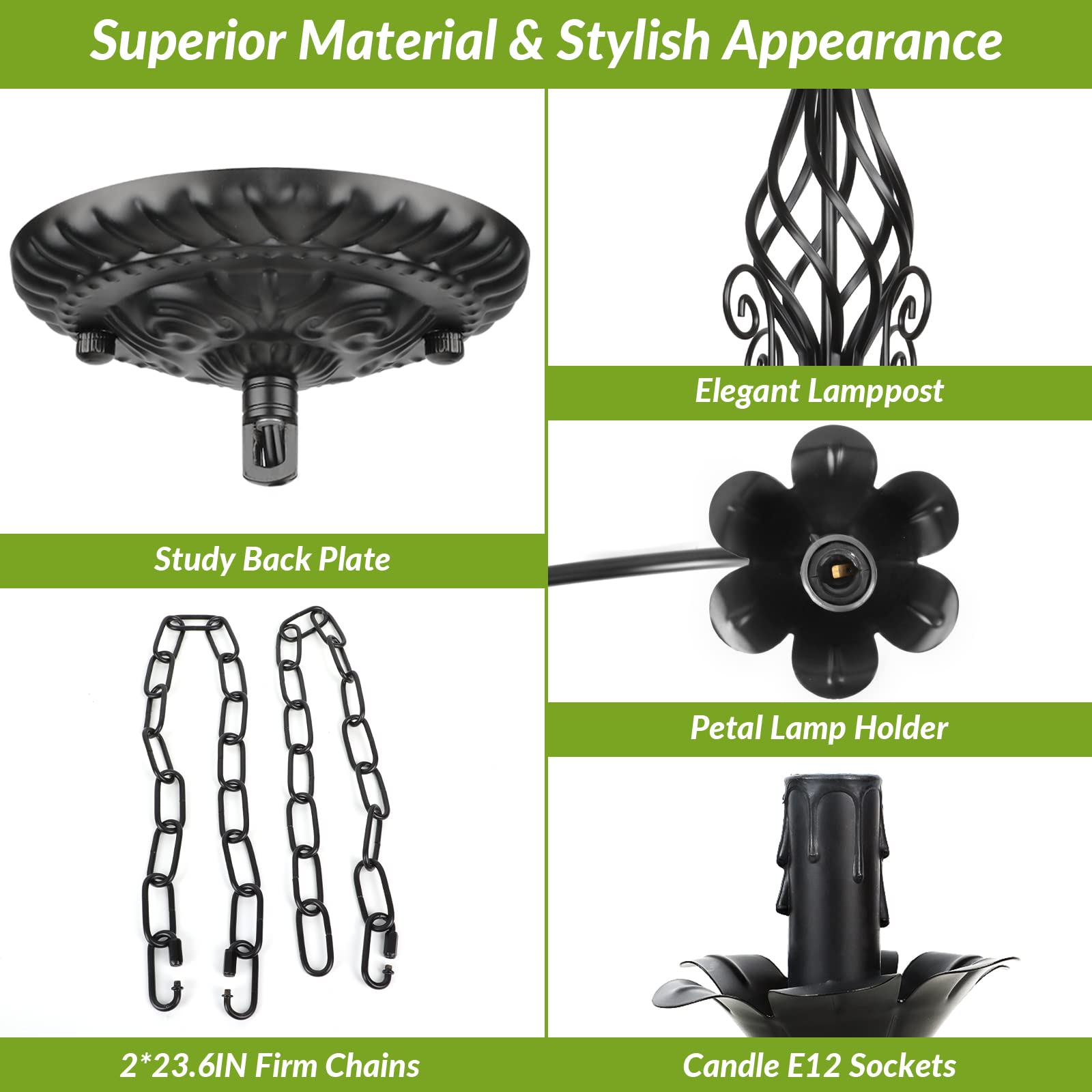 • 6 E12 Bulb Sockets: 6 E12 bulbs are required to the black chandelier light fixture, Max. 40W/per bulb. You can apply incandescent bulbs for vintage ambience and LED bulbs for modern effect, warm white glow creates welcoming, relaxed and soft atmosphere, daylight white bulbs brights clean and neat feeling. Just choose the bulbs according to your demand. (bulb is NOT included)