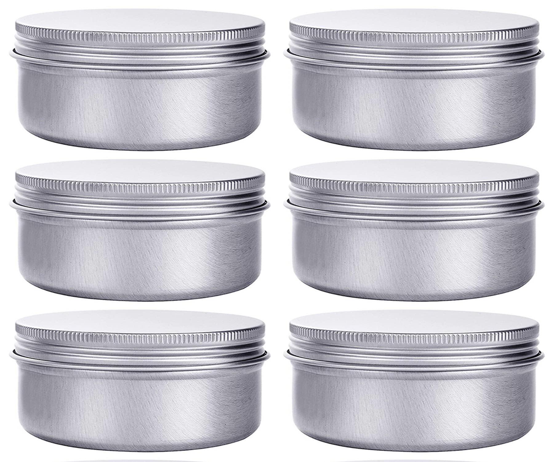 • What You Get: 6 Pcs aluminum round containers with screw lids, Silver color, These tin cans have no sharp edges, all edges are rounded and are seamlessly formed.