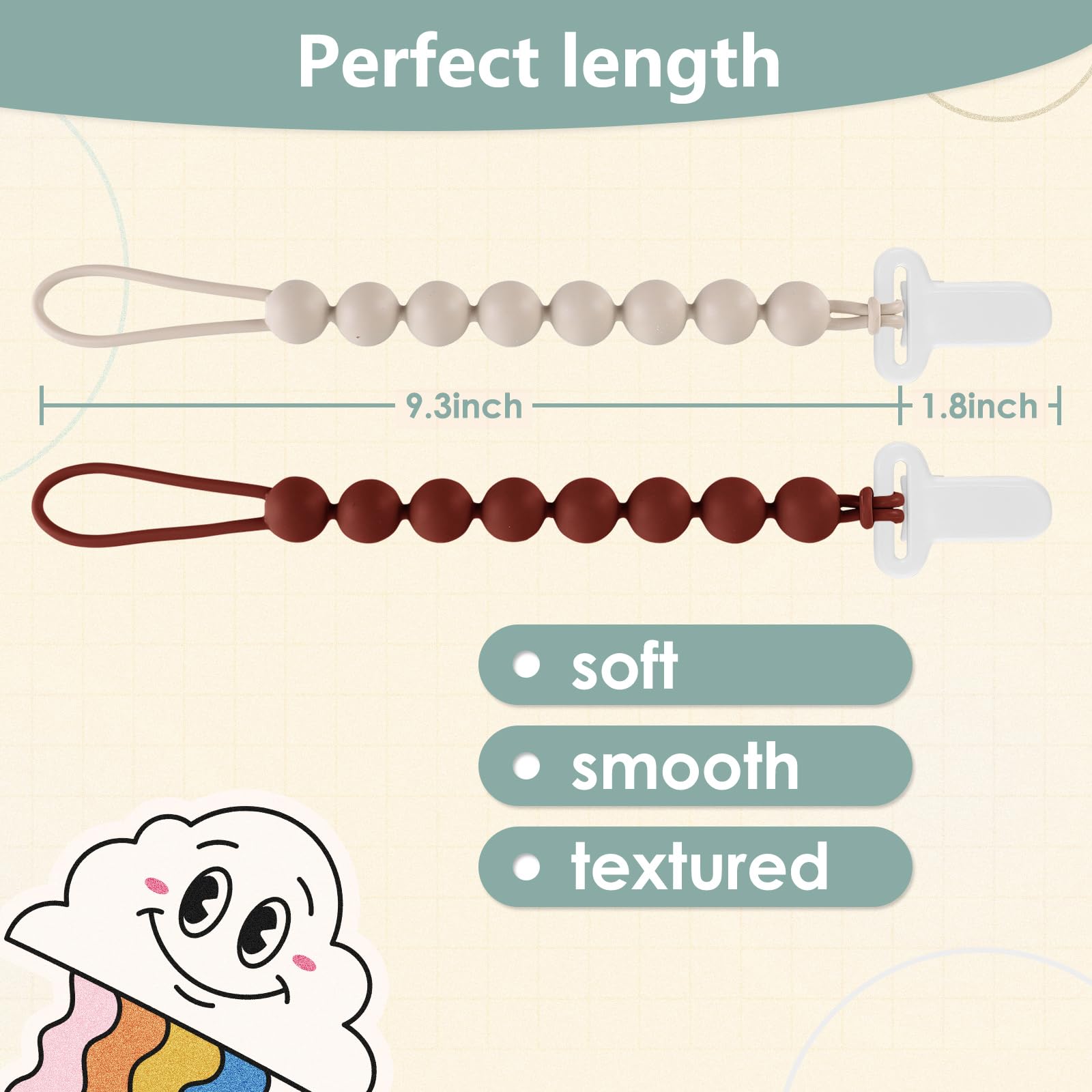 • Dual Function: Teething Relief and Stimulation - Our silicone pacifier clip doubles as a soothing teether, gently massaging sore gums during teething. Its vibrant beads also offer sensory stimulation, keeping your little one engaged and comfortable.