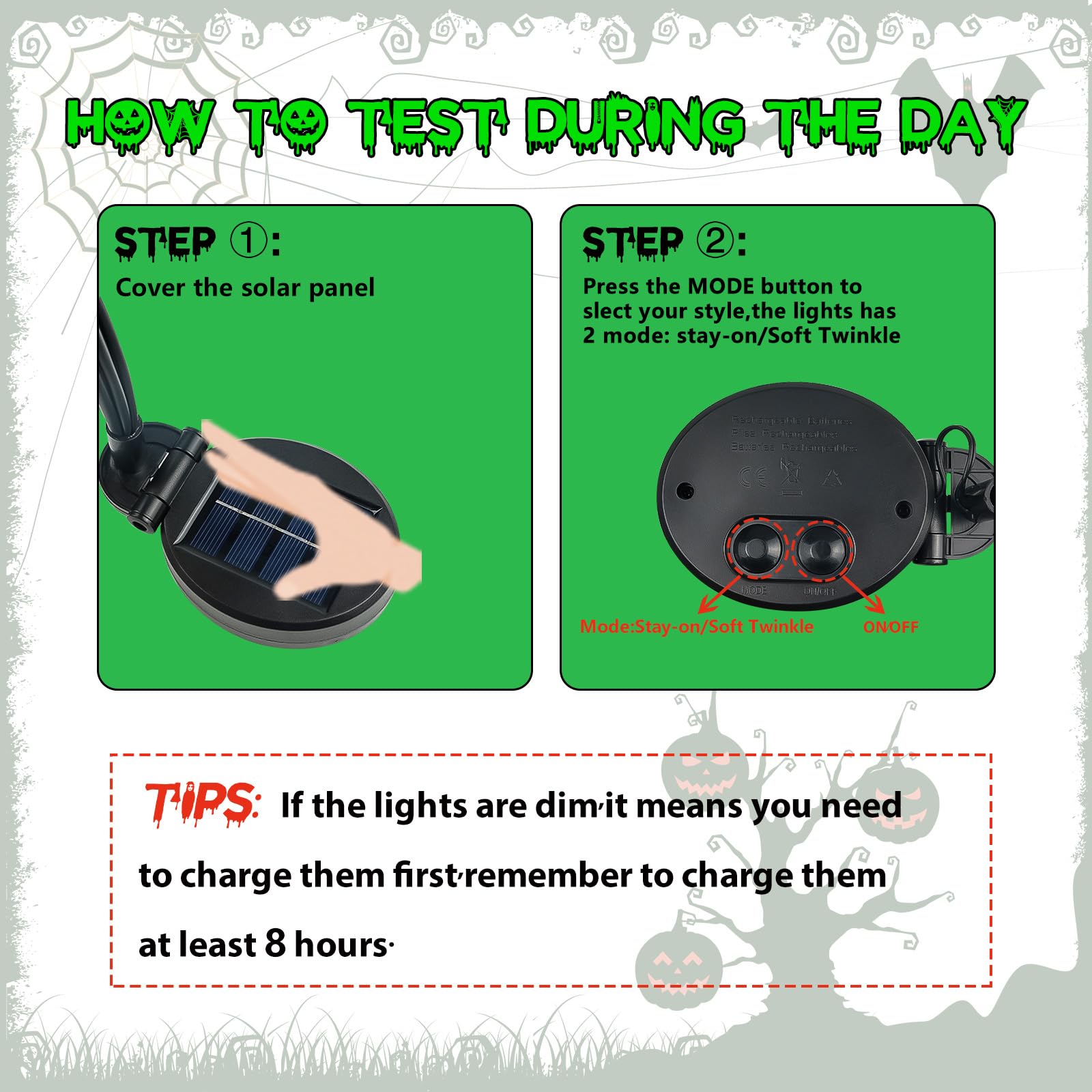 • Upgraded Two Lighting Modes: The outdoor Halloween solar lights have 2 lighting modes (Steady On and Soft Twinkling Mode) to meet your different outdoor Halloween decoration needs which can add a lot of vitality to your garden. The steady on mode can meet the needs of most people, the lights will steady on one color as long as it has power. The soft twinkling mode can breathe like fireflies, adds more spunk and mischief to Halloween!