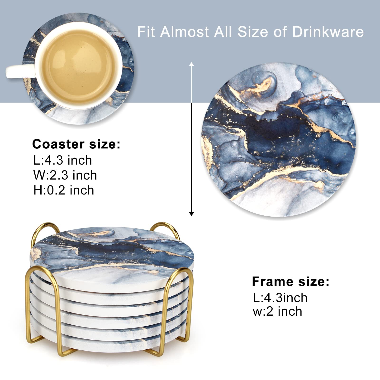 6 Pcs Navy Blue Marble Abstract Ceramic Coasters with Holder Best Absorbent Drink Coasters Round Ceramic Table Coasters Set Decorative Coffee Cup Beverage Coasters Wine Beer Bar Coasters