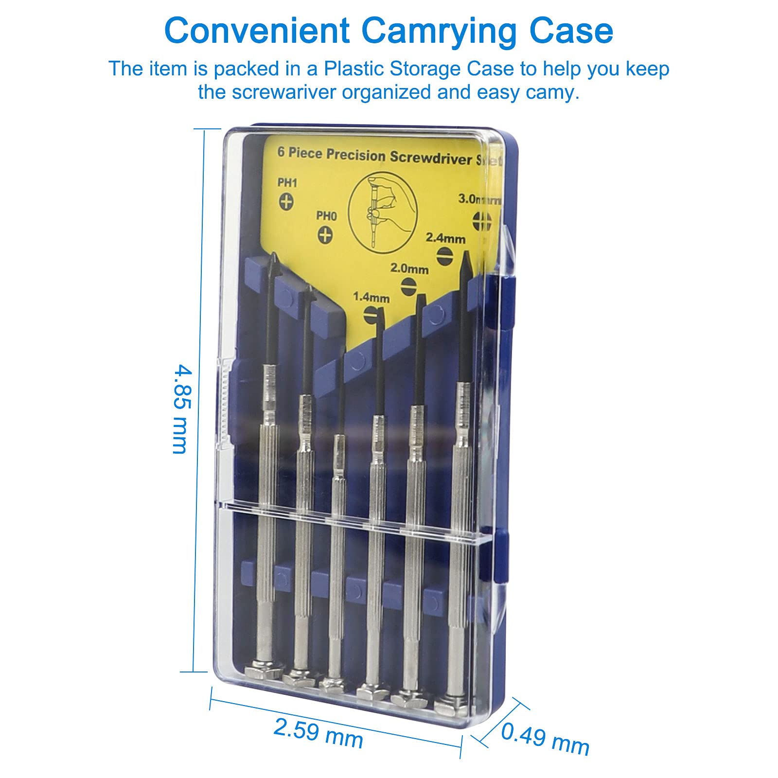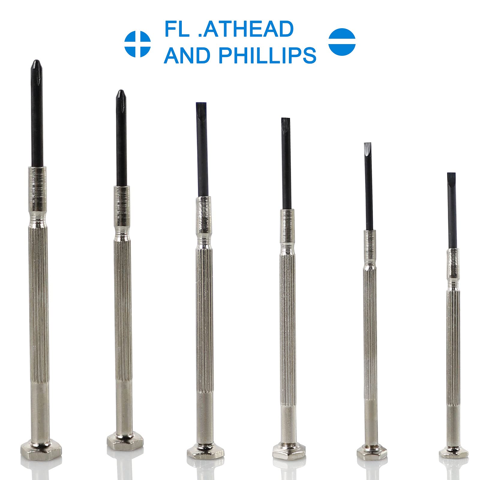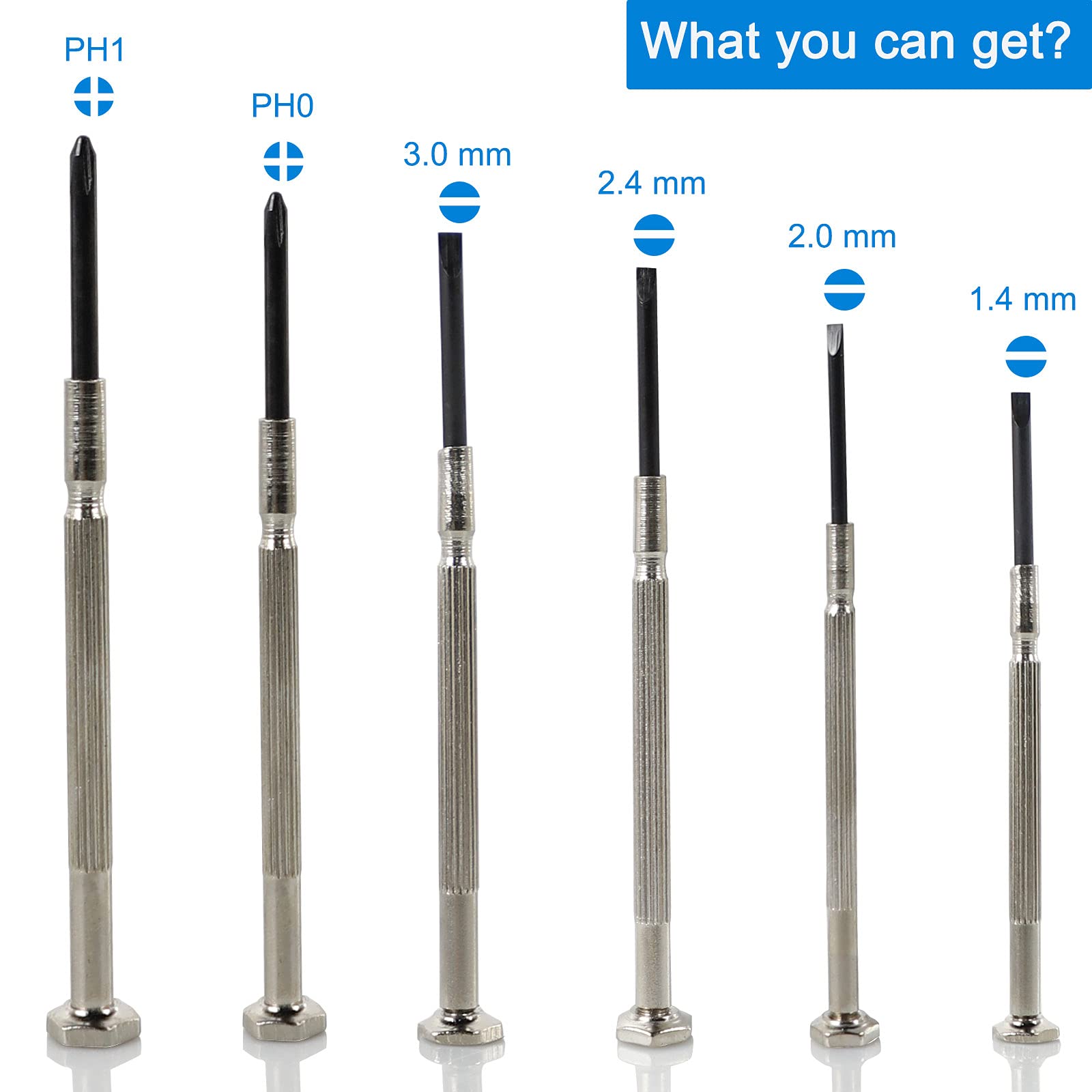 • 1【6 Different Sizes】Precision screwdriver set, The set includes 2 cross sizes (#0,#1); 4 flat head sizes(1.4 mm, 2.0 mm, 2.4 mm, 3.0 mm); mini screwdriver is your daily electronic repair, watch repair, jewelry repair Perfect choice for any other small screws.