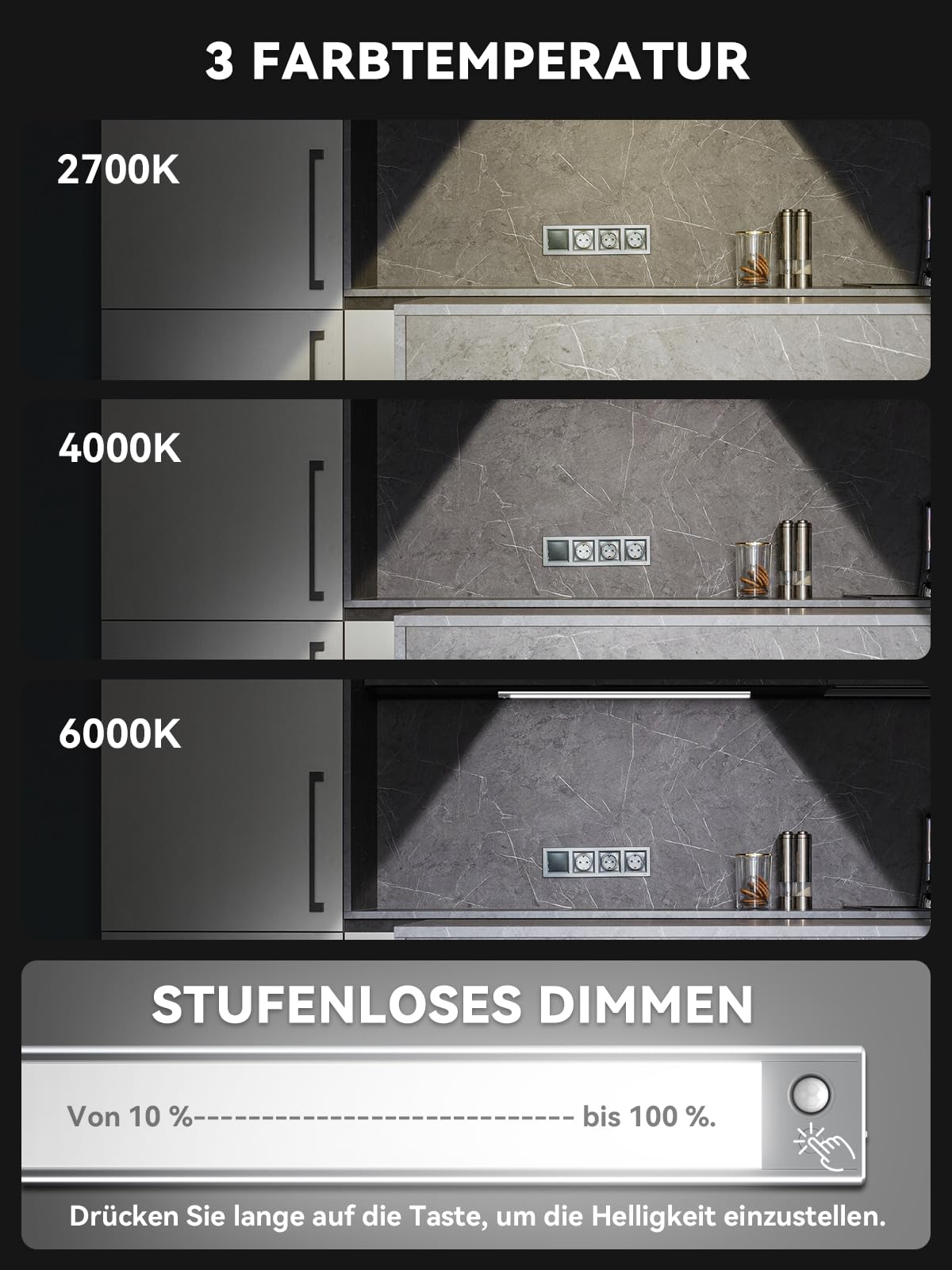 • Durable battery: Equipped with a built-in 4500 mAh battery, this under cabinet light can last for over 1 month when fully charged in motion sensor mode. In continuous operation, the running time can be over 10 hours. The light offers 3 adjustable colour temperatures (2700 k/4000 k/6000 k) and continuous dimming, you can adjust the lighting according to your wishes. Double click to change the colour temperature, and long press to adjust the brightness.