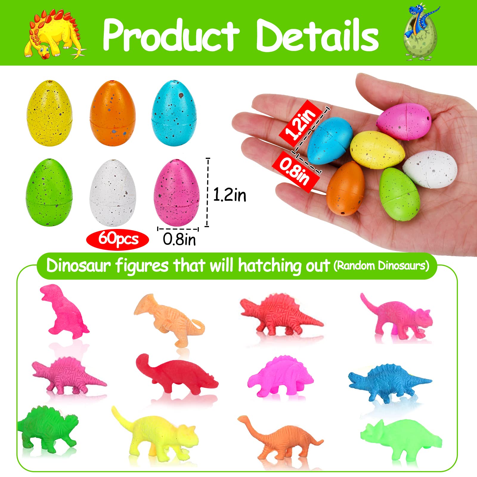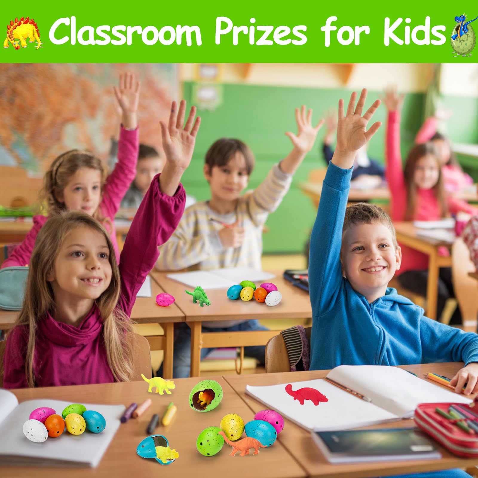 • 【Novelty Hatching Dinosaur Toys】Just place then in a bowl of water (<100℉), a mini dinosaur would break up the shell in 12-24 hours and hatch, these dinosaur figures will keep growing up in 1- 2 days. Inside is one of those squishy water growing toys, if you take it out of the water it will shrink again. Great as goodie bag stuffers, treasure box toys, birthday party favors supplies, Pinata fillers, classroom prizes bulk for students or Easter egg basket toys, Halloween goody bag stuffers, Christmas stocking fillers, or end of the year gifts for students, graduation party favors.