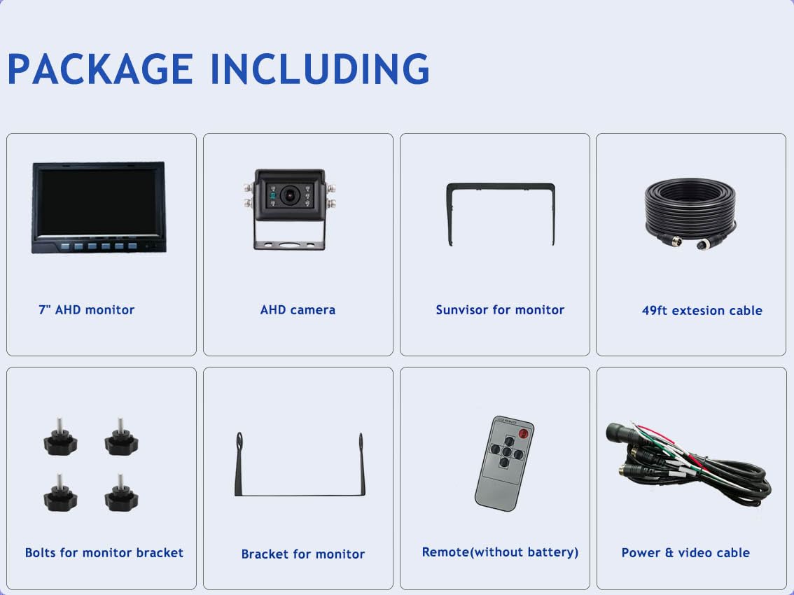 • 【APPLICATIONS】This is an upgraded industrial grade ahd 1080P wired one camera system. For its high vibration resisance ability of 10G and wide power input range DC12-24V, it is suitable for large vehicles, such as buses, box trucks, pickup trucks, garbage trucks, flatbed trucks, dump trucks, street sweeper trucks, refrigerator trucks, motor homes, vans, skid steers, farm tractors, combines, cotton pickers, crop sprayers, bulldozers, snow plows, forklifts, excavators, heavy equipments,etc.