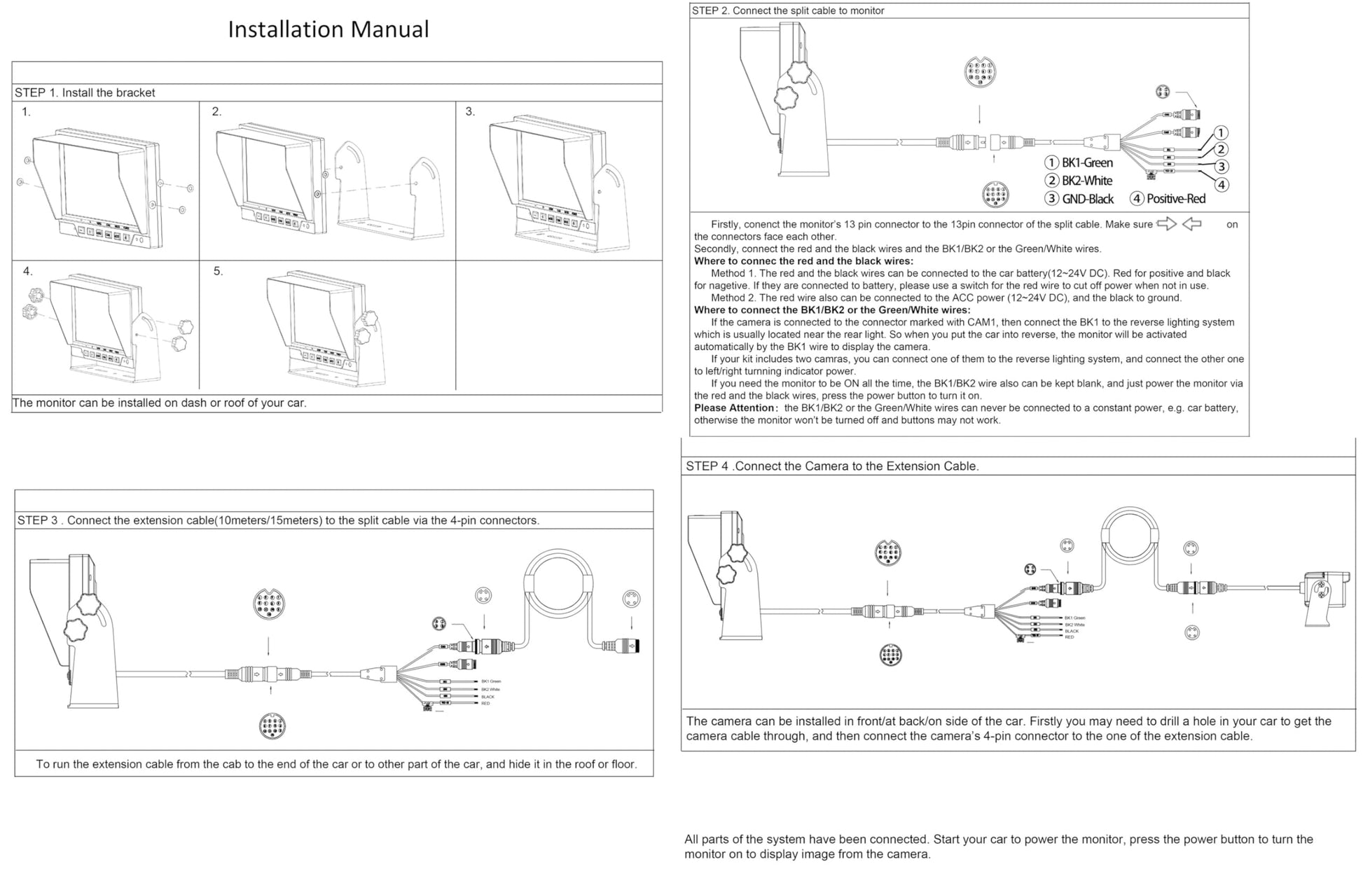 • 【Unique Selling Proposition】①Monitor has 2 trigger wires. Monitor will be triggered to be turned on automatically to display camera image when reversing. After reversing, the monitor will be back to the pervious mode. ②This system has two viewing options(view when reverse or remain on continuously). ③We uses waterproof Aviation 4-pin screw connectors, NO BNC/RCA. ④Easy to install. ⑤Two-year warranty and life-time tech support.