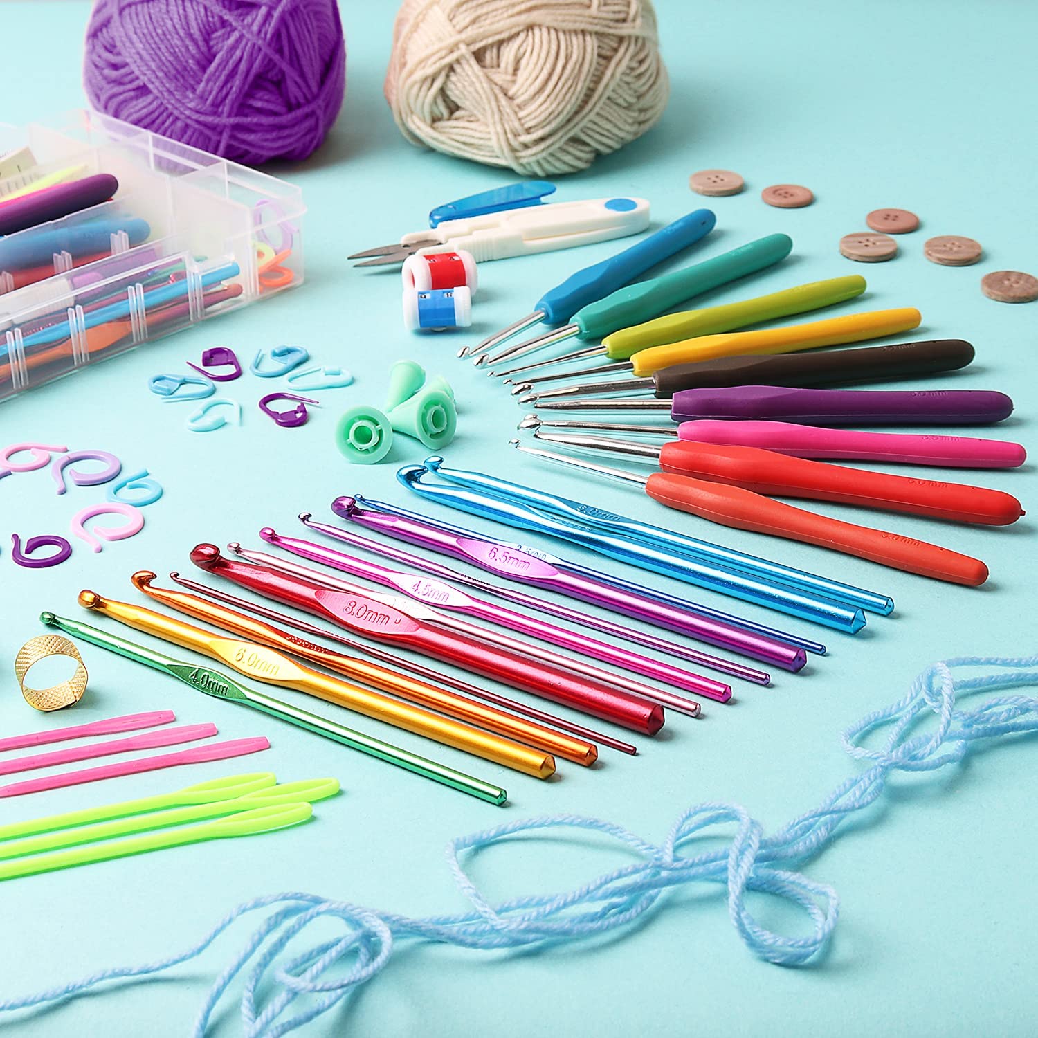 • CROCHET SUPPLIES: Our crochet accessories set includes crochet stitch holders, crochet stitch markers and a row counter. It also includes safety pins, sewing needles, a pair of scissors and a tape measure.