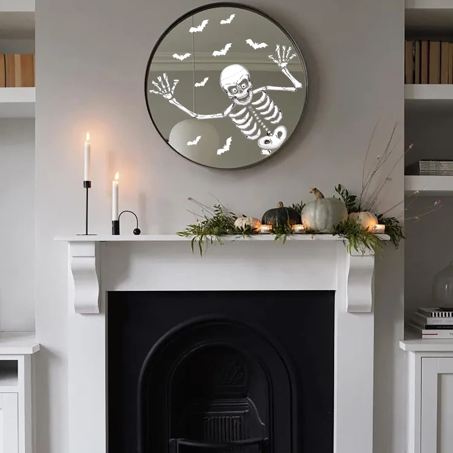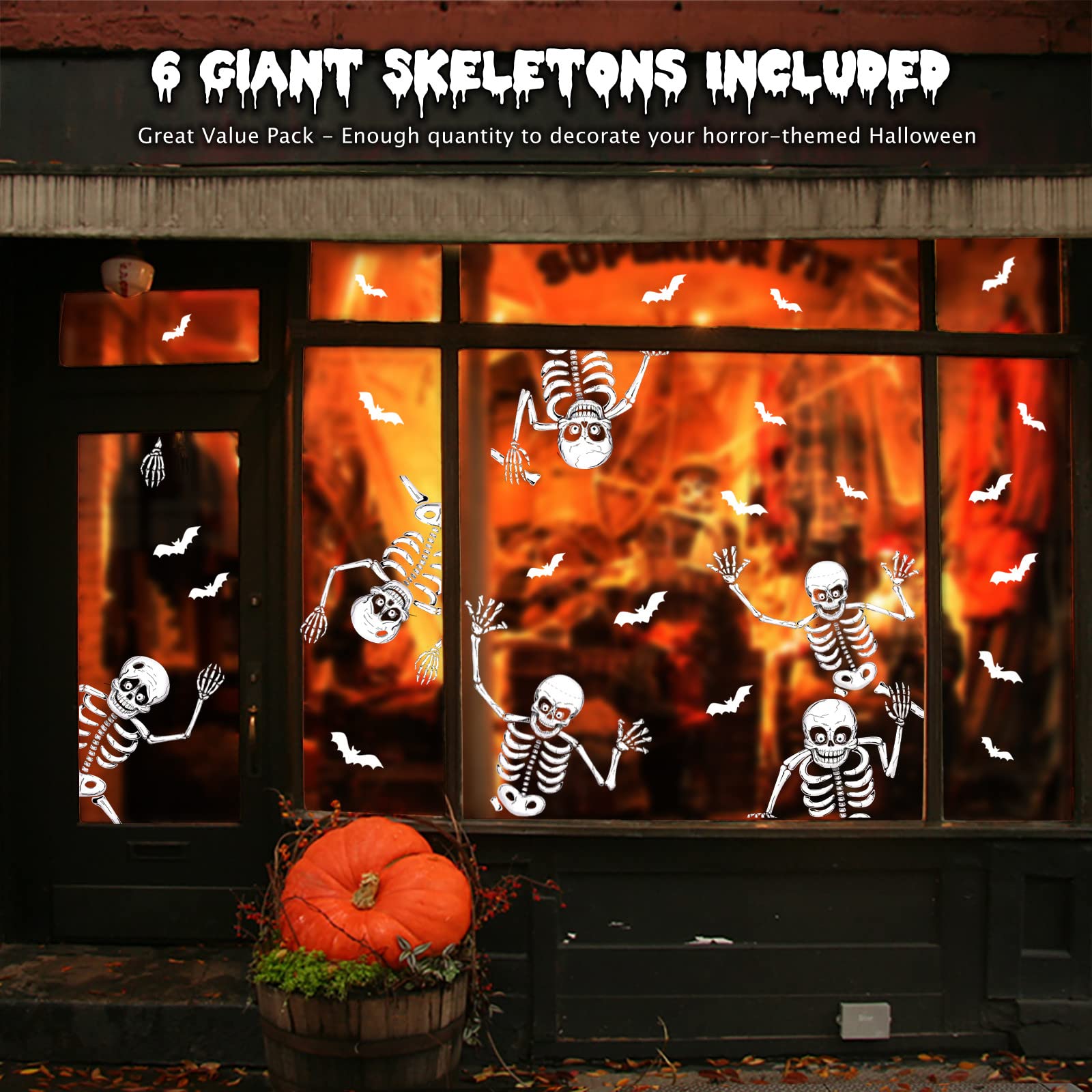 • 6 Giant Skeleton Window Clings: Our Halloween-themed skeleton decorative window stickers come in 8 LARGE sheets, each sheet measures 14.6' X 11.4' and includes 6 GIANT SKELETONS and 28 BATS; The skeletons are divided into several pieces, so you can freely combine and adjust them into the shape you want; These super cool and creepy skeleton Halloween window clings will impress your neighbors and passersby