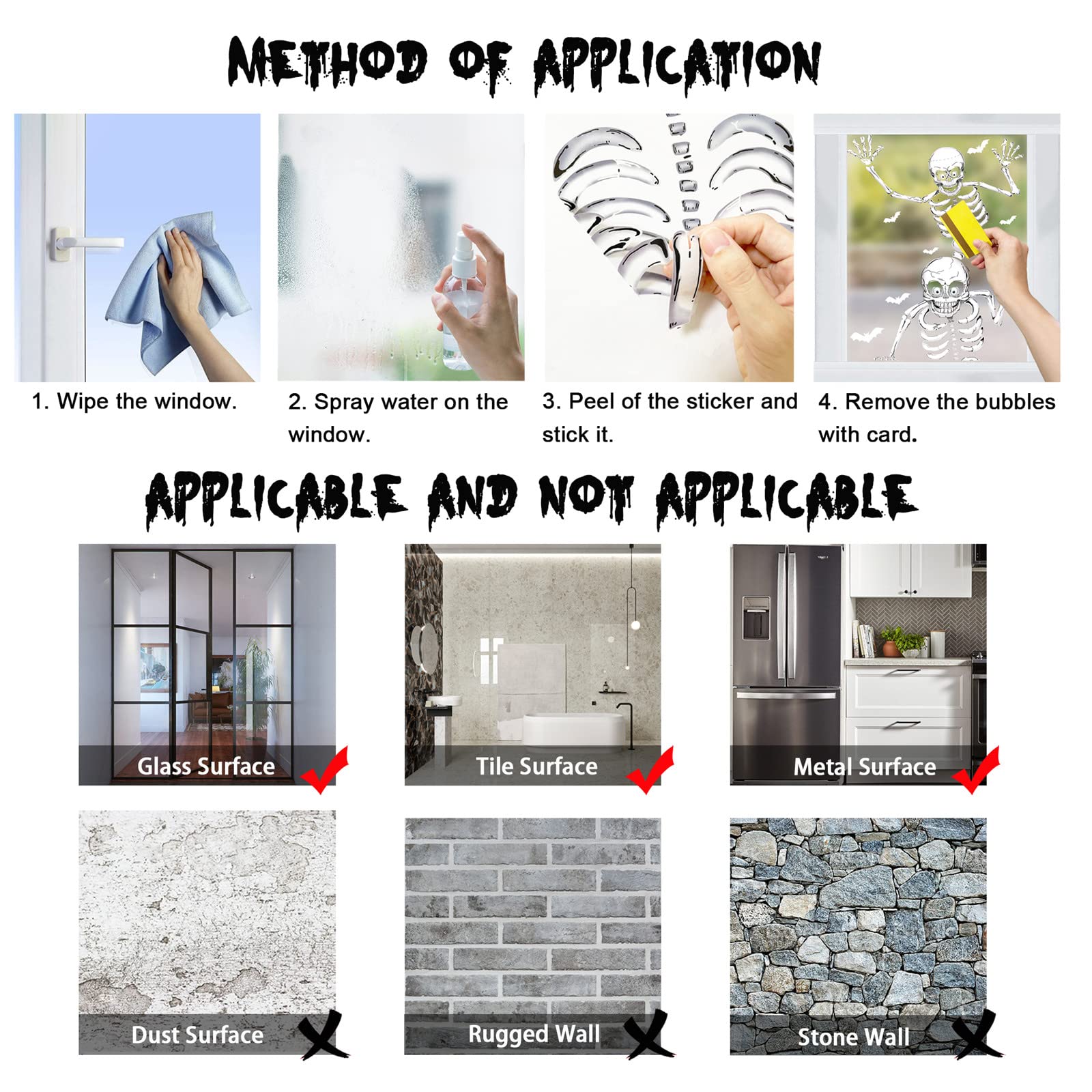 • No Glue Needed & Easy to Stick On and Peel Off: Our Halloween window clings can be firmly stuck to any flat and smooth surface without any glue and tape; Just clean and sprinkle a little water on the glass, then peel off the window sticker and stick it on the window, finally use a card to scrape out the bubbles; They can be removed easily and will not leave any marks