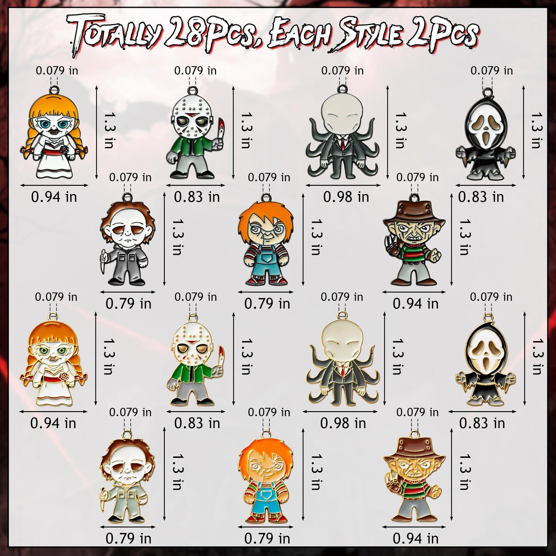 • Horror Movie Charms - The package includes 28pcs Halloween enamel charms in 14 styles (Each Style 2pcs). Full of horror movie character elements, these scary charms are great for various party outfits, such as Halloween, horror movie game-themed parties, birthdays, dress-up parties, etc.