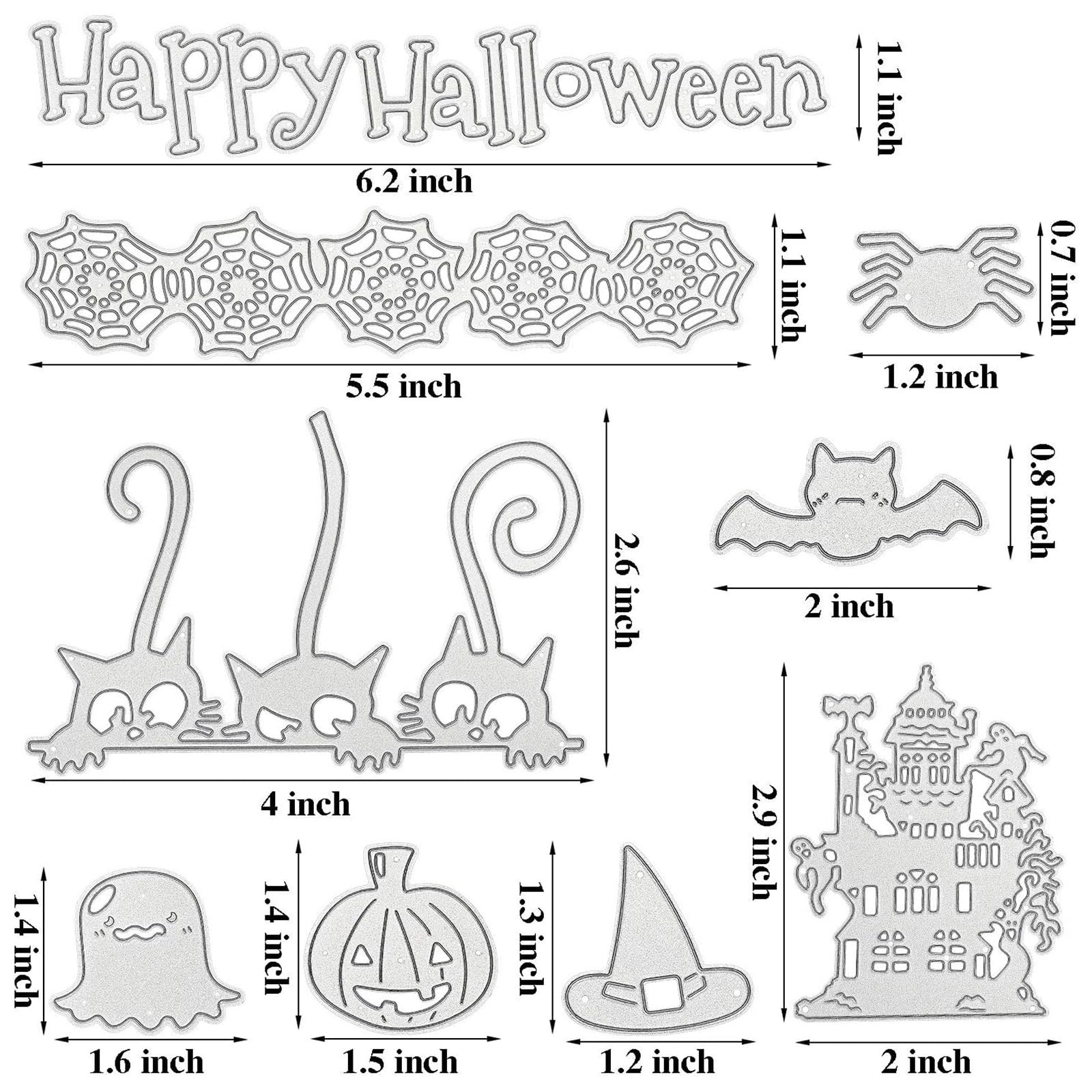 • Halloween-themed design: these Halloween cutting dies are available in 9 different styles, including letters of 'happy Halloween', pumpkin, skull house, ghost, cat, spider, witch hat, bat and spider web, meet the theme of Halloween, elegant and vivid, help you to create beautiful crafts according to your imagination