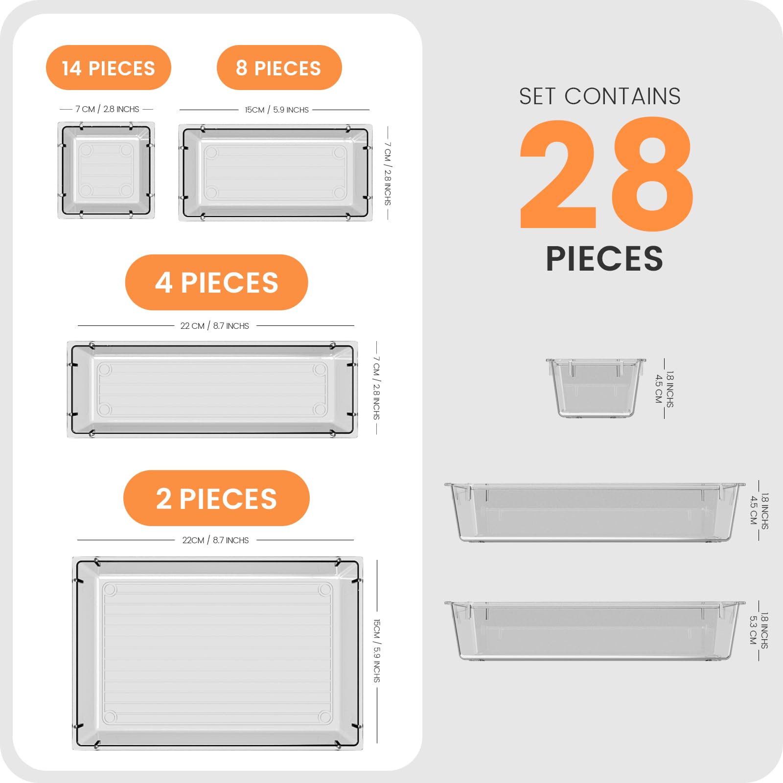 • 【Holds 177 Items】 ---- Organize up to 177 everyday items in one set! These 28-piece clear drawer organizers fit effortlessly into bathroom drawer organizers, vanity organizers, office drawer organizer, bedroom, closet, or garage drawers. They offer smart organizers and storage solutions for every space. From lipsticks to forks, batteries to binder clips—there’s a place for everything.