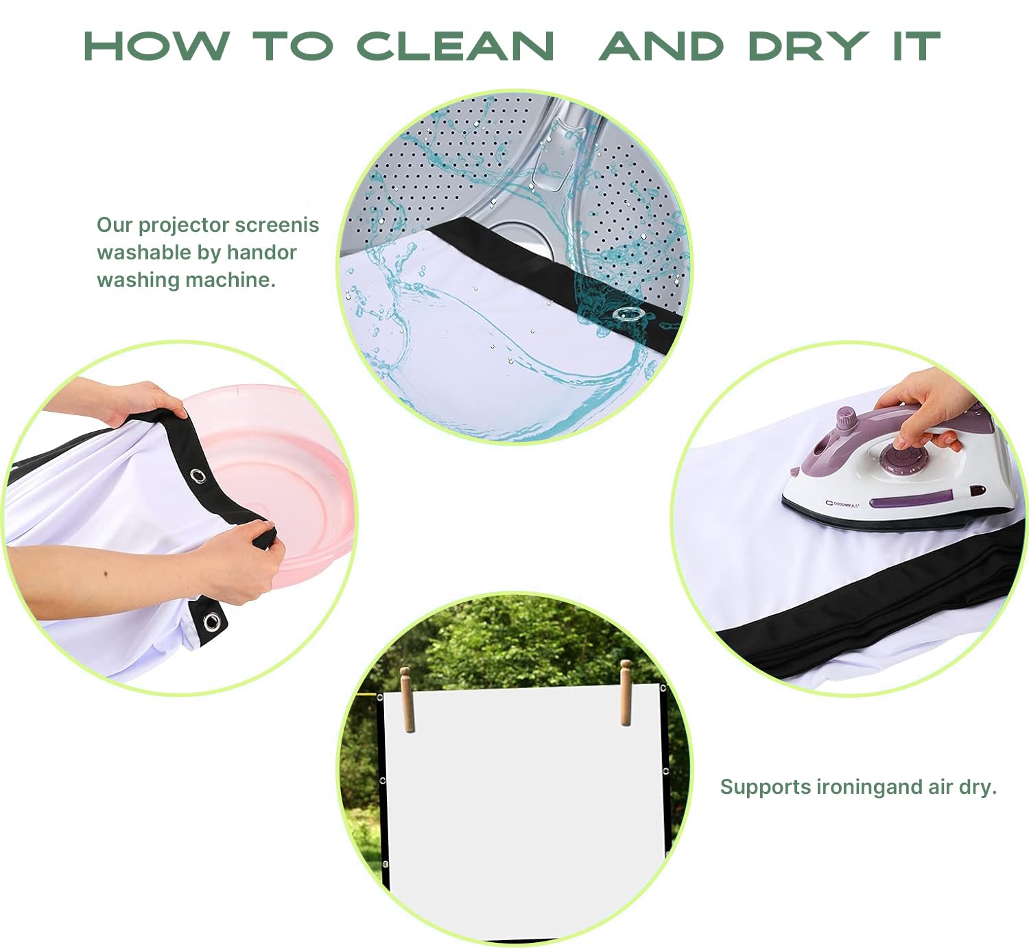• Thickened Fabric for Superior Viewing: Our outdoor projection screen features a white movie screen sheet made from high-quality fabric. The enhanced thickness ensures a smooth surface and optimal projection clarity, bringing your movies to life in stunning detail,It uses washable materials and can be washed either by hand or in a washing machine.
