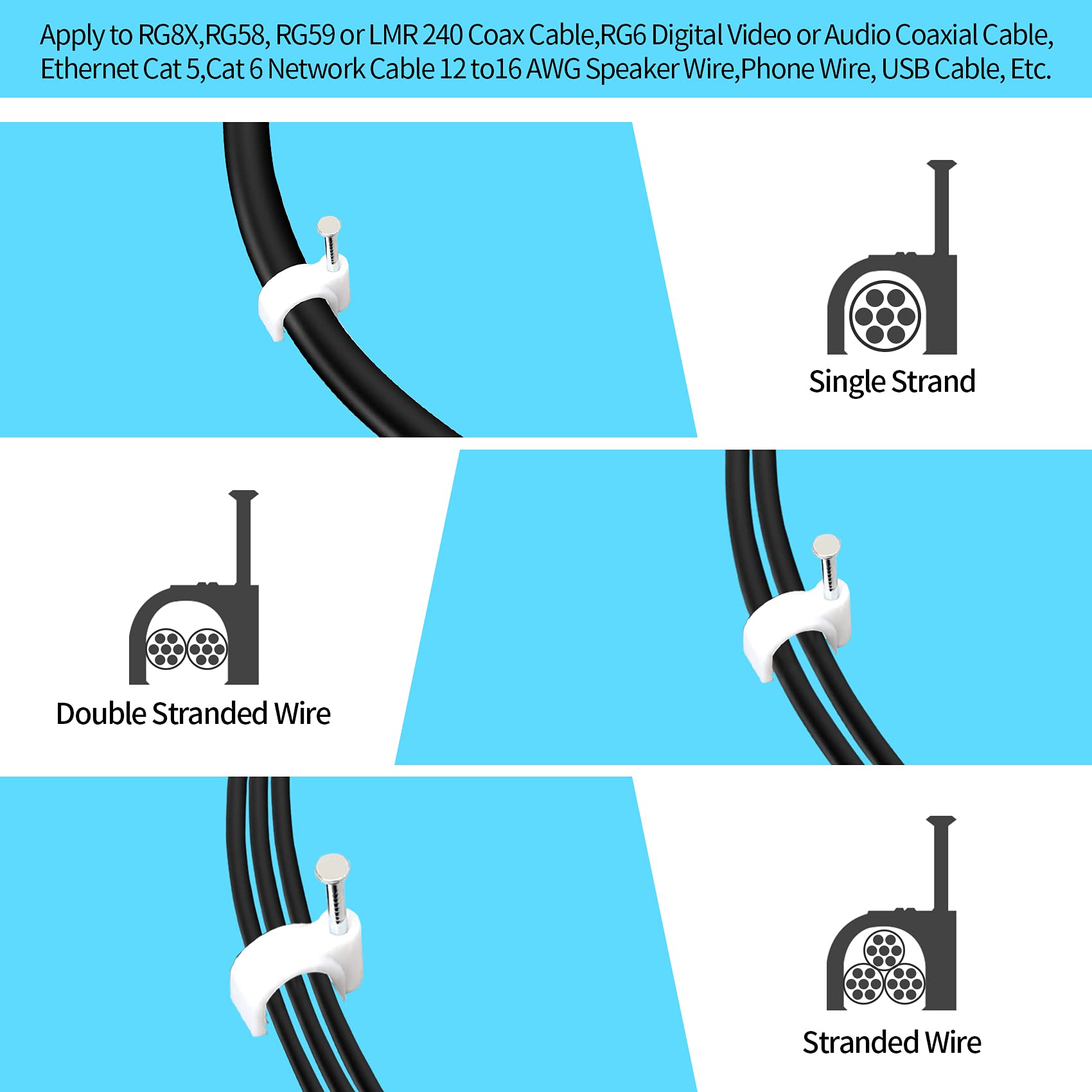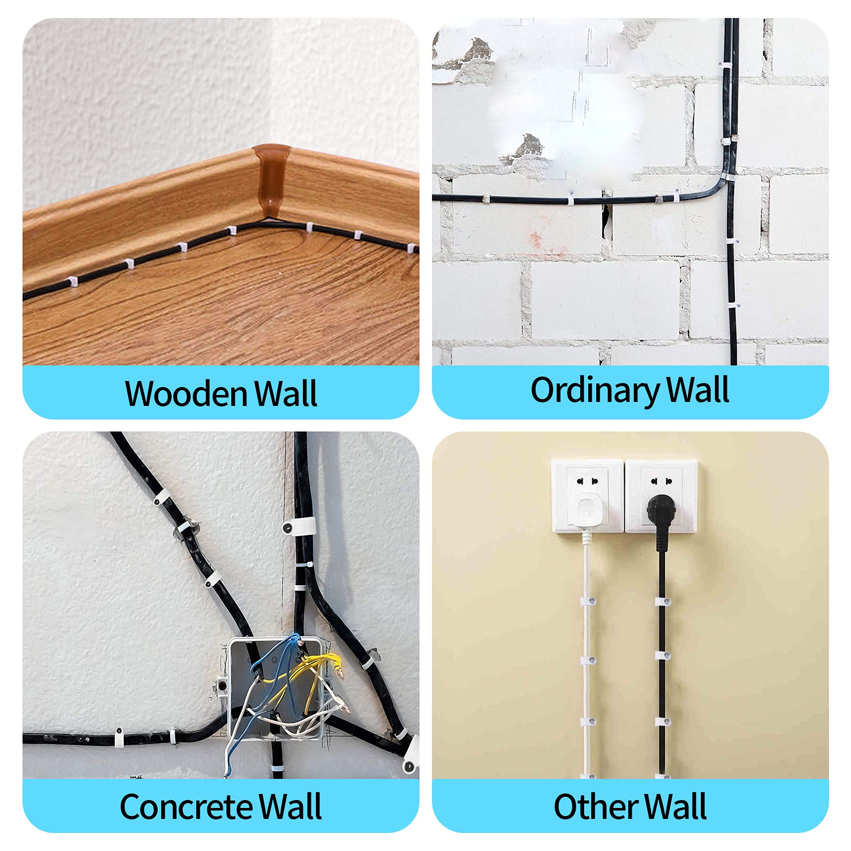 • [ Easy Install ] The installation steps of the wire clip are very simple and can be completed by one person. Insert the cable into the clip slot, hammer the nail into the wall, wood, plaster, brick, etc. With a long nail, it won’t easily fall.