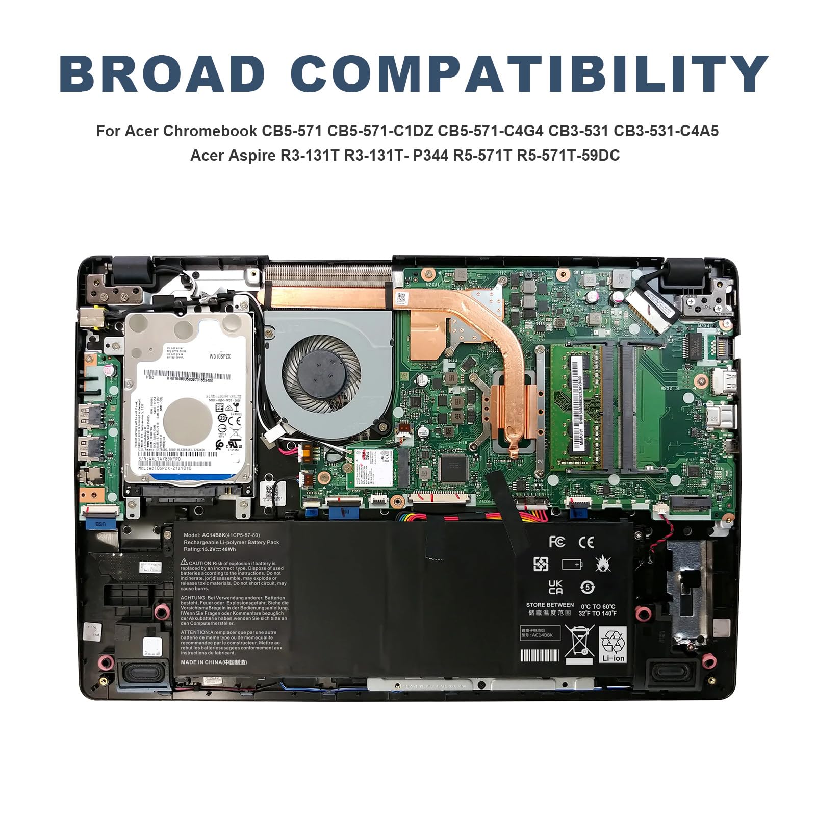 • Battery Type: Li-ion Voltage: 15.2V Capacity: 48Wh. Cells: 3-Cell Color: Black; The AC14B18J AC14B3K AC14B8K 3ICP5/57/80 4ICP5/57/80 KT0030G.004 KT.0040G.004 works with Acer Chromebook 11 CB3-111 CB3-111-C8UB 13 CB5-311 15 CB3-531 C910 Aspire E3-111 E3-112 E3-112M ES1-511 ES1-512 Gateway NE512 TravelMate B115-M B115-MP Series Laptop Notebook Battery .