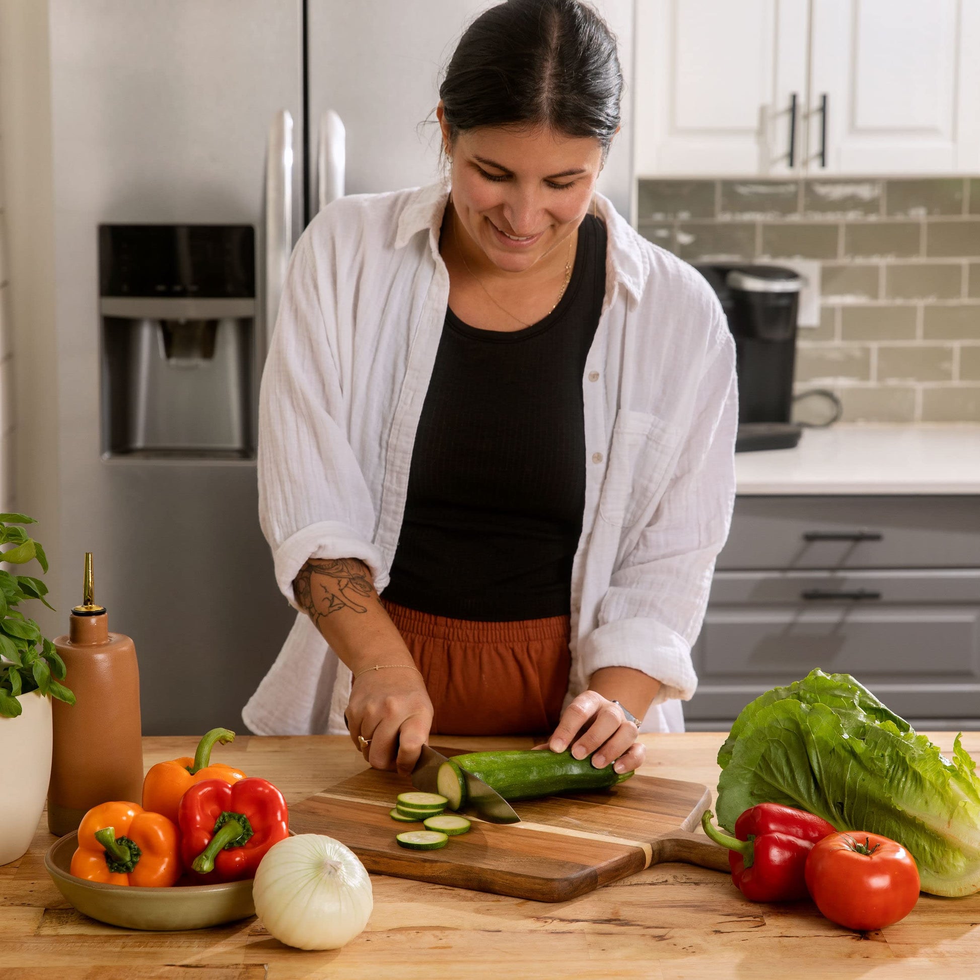 • Natural, Heavy-Duty Acacia Wood – Our wood cutting boards for kitchen use are crafted with a premium-grade acacia wood that’s strong, more durable, and longer-lasting than plastic, bamboo, walnut, or other traditional serving boards