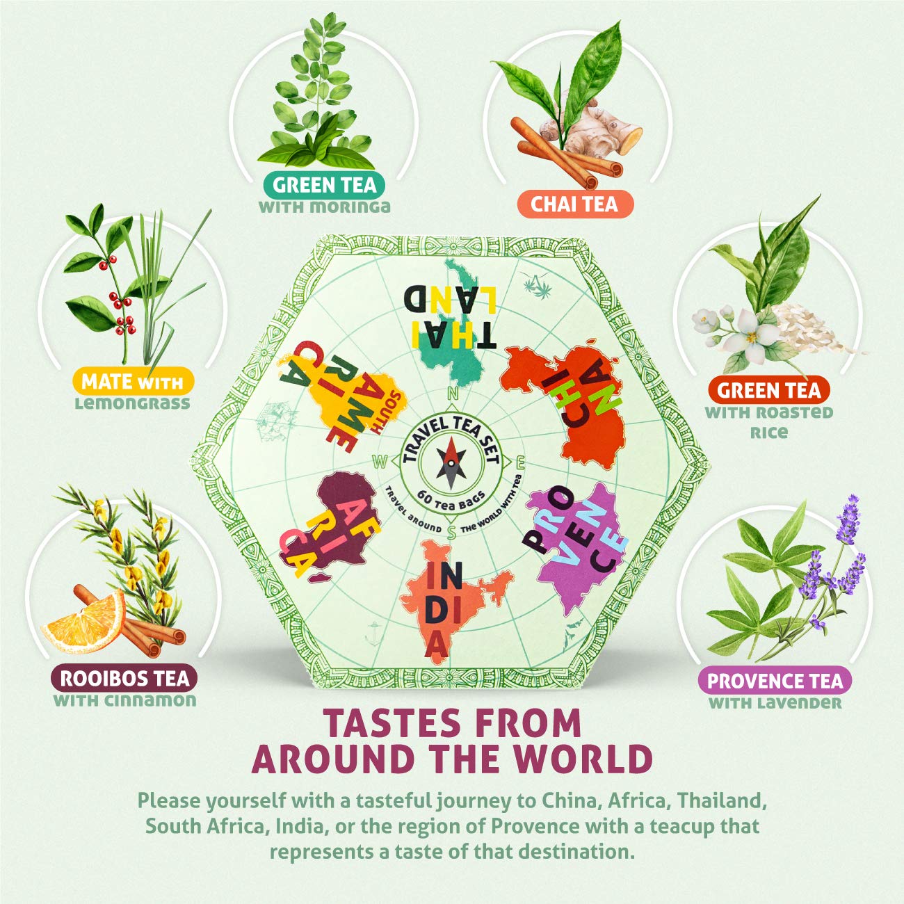 • 60 NATURAL HERBAL AND FRUIT TEA BAGS TO TRAVEL AROUND THE WORLD. Please yourself with a tasteful journey to China, Africa, Thailand, India, or the region of Provance with a teacup that represents a taste of that destination. Our 100% natural tea set contains an impeccable mix of tastes and experiences. Free from artificial additives, colorants, or flavor enhancers, made to be enjoyed the way the most demanding of tea lovers deserve.