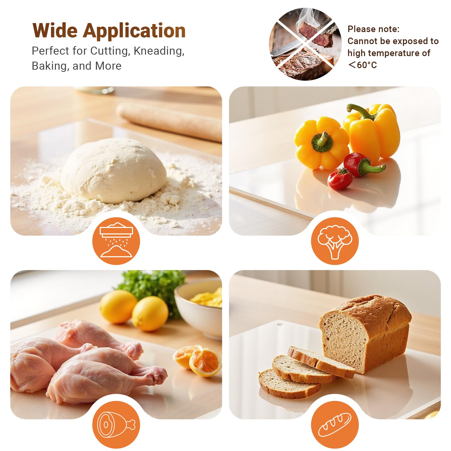 • WIDELY USED: Acrylic cutting board for kitchen counter have a wide range of uses as kitchen accessories. Clear cutting board for kitchen can be used to cut bread, fruit, vegetables, meat, etc. They are perfect for processing vegetables, sandwiches, pizza, cakes, and other foods. In addition, they can also be used as kitchen decor, children's dinner boards, charcuterie boards, dough mat, pastry mat, etc. (Note: Acrylic material is not scratch-resistant, please use only for cutting, do not chop.)
