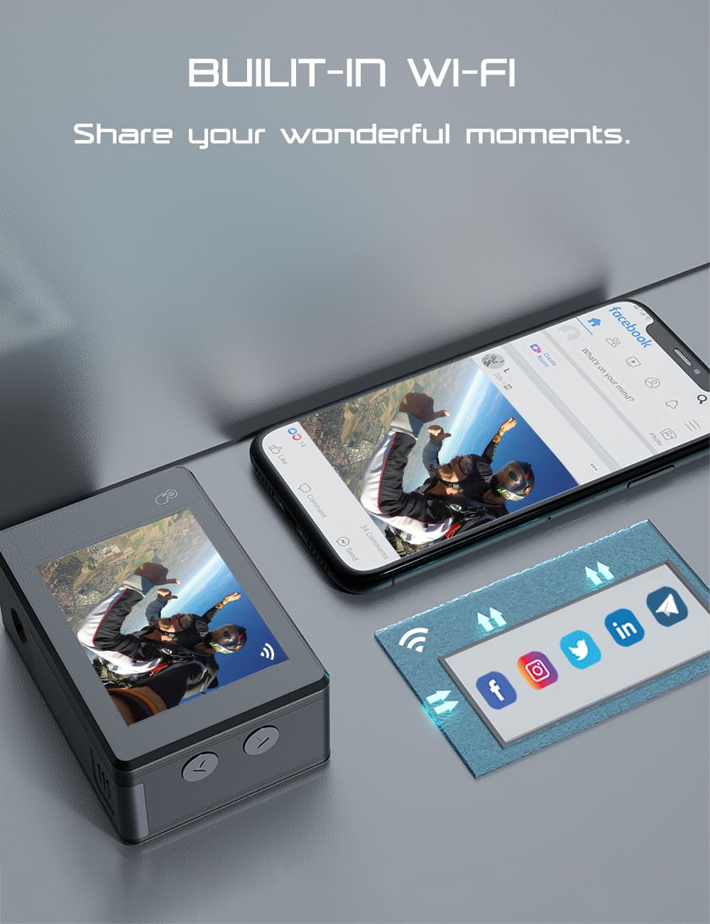 • 📸【40M Waterproof and 2.4G Wireless Remote Control】The included waterproof case protects Apexcam underwater camera from diving to depths of up to 40 meters perfect for swimming, diving, surfing, snorkeling and motor boating. The 2.4G wireless remote control allows you to freely control the camera when you mount it on a helmet, bicycle or other device.