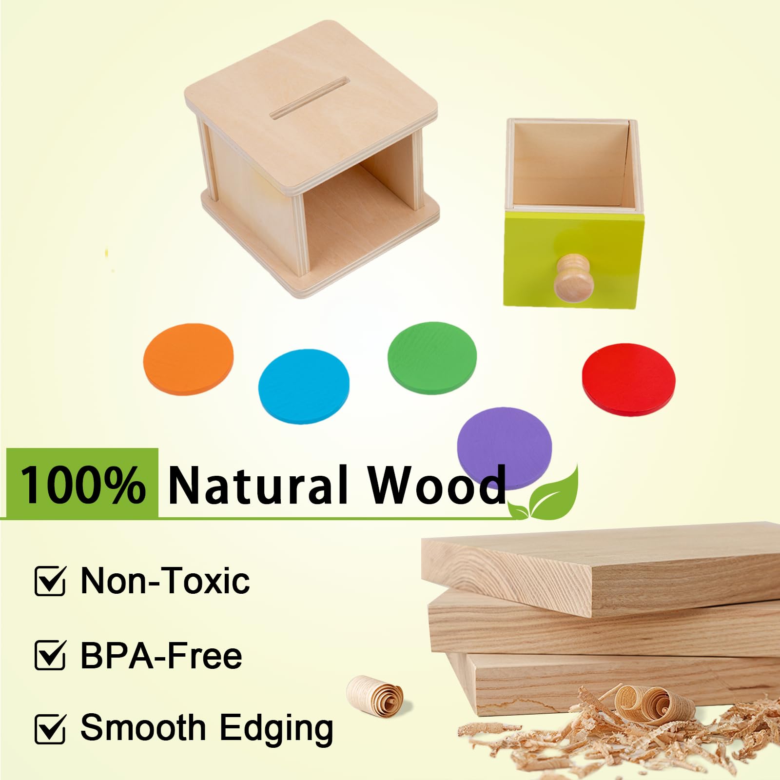 • 🌈【Multi-Functional Design】:This wooden coin box functions as a shape sorter and storage box, with 6 colored discs and a small drawer, helping babies explore colors and shapes while storing toys.