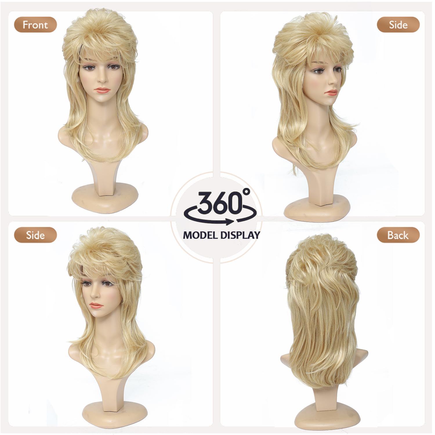 • AUTHENTIC STYLE: Classic 80s mullet design featuring voluminous layers, feathered bangs, and shoulder-length cut in light blonde shade